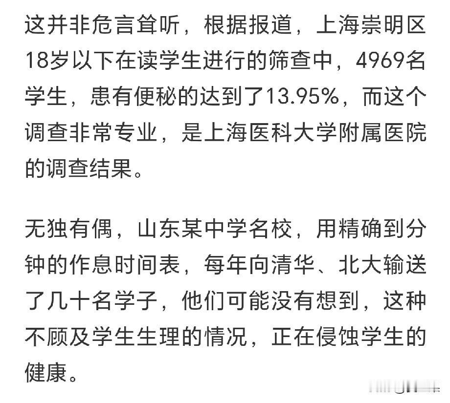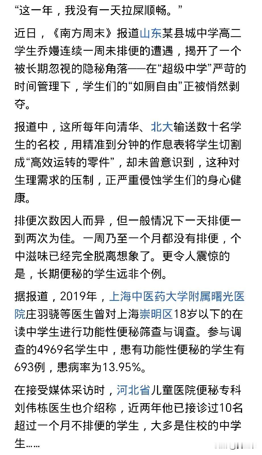 每周末接孩子的时候,我都会买香蕉, 原因很无奈,孩子住校一周,只有回到家才会解大便。 他说好多同学在学校都不解,因为没有时间。 是怕耽误时间吧? 他说是。 所以他一回到家,能在厕所待一个小时。 当然有时候会拿着手机,有时候拿本书。 只有在家,他才放松下来,好好排下便。 我给他买蜂蜜,蜂蜜通便,让他带学校拌着热水喝,他说不管用,还是解不下来。 我看是心理作用,在学校时间紧,学习任务重,学生都在争分夺秒学习,没空蹲便。 还有就是喝水少,哪像我们在家或者上班,接杯水一会儿就喝完了。 国庆假期和同学一块儿聚餐时,我专门问了下,家有初中高中生的竟然都遇到了这个问题。有的一个月都不拉便。真是让人难以想象。
