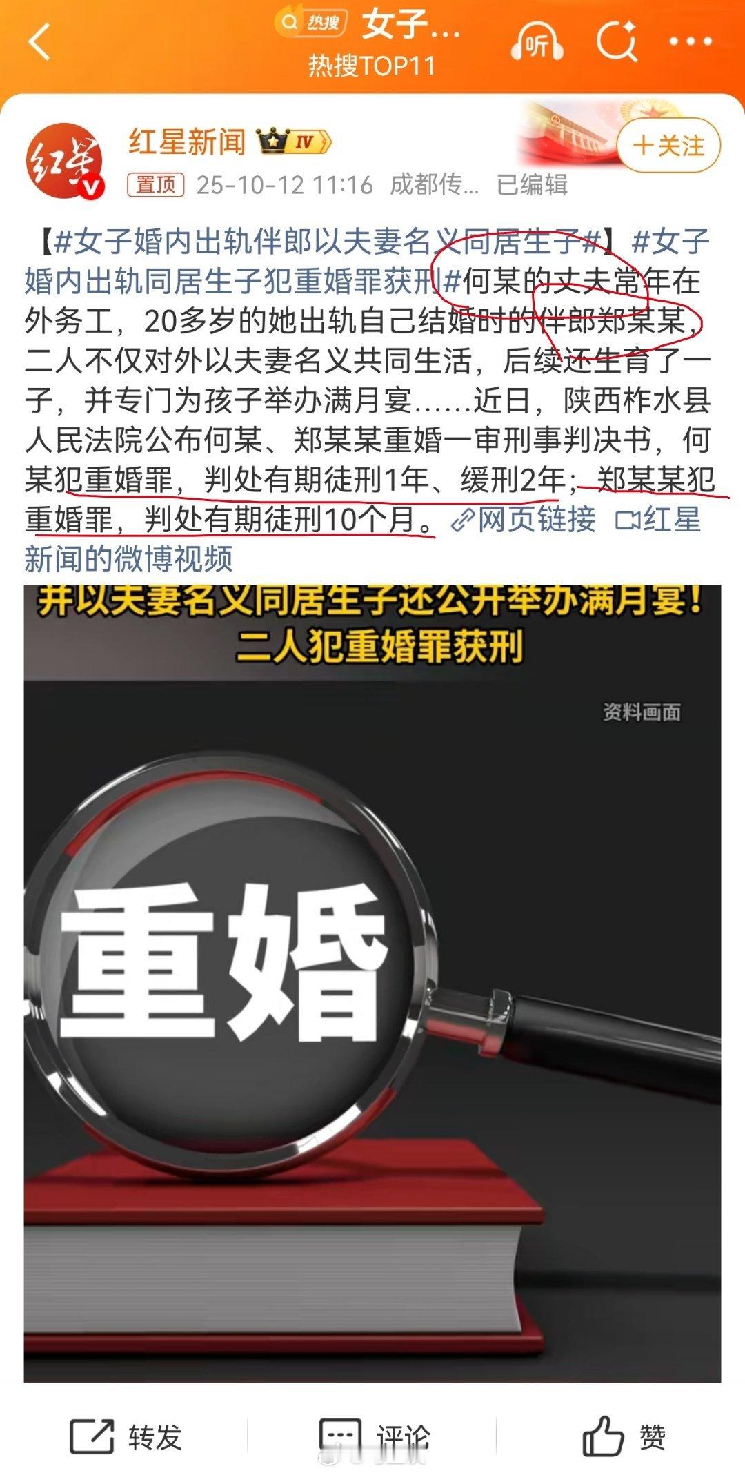 奇葩!女子婚内出轨伴郎,以夫妻名义同居生子被判刑!只是我不明白,重婚男女双方同样的罪行,女方判了缓刑,男方则是10个月实刑?这里有什么说法吗?[疑问]