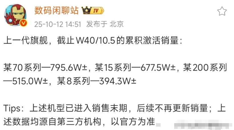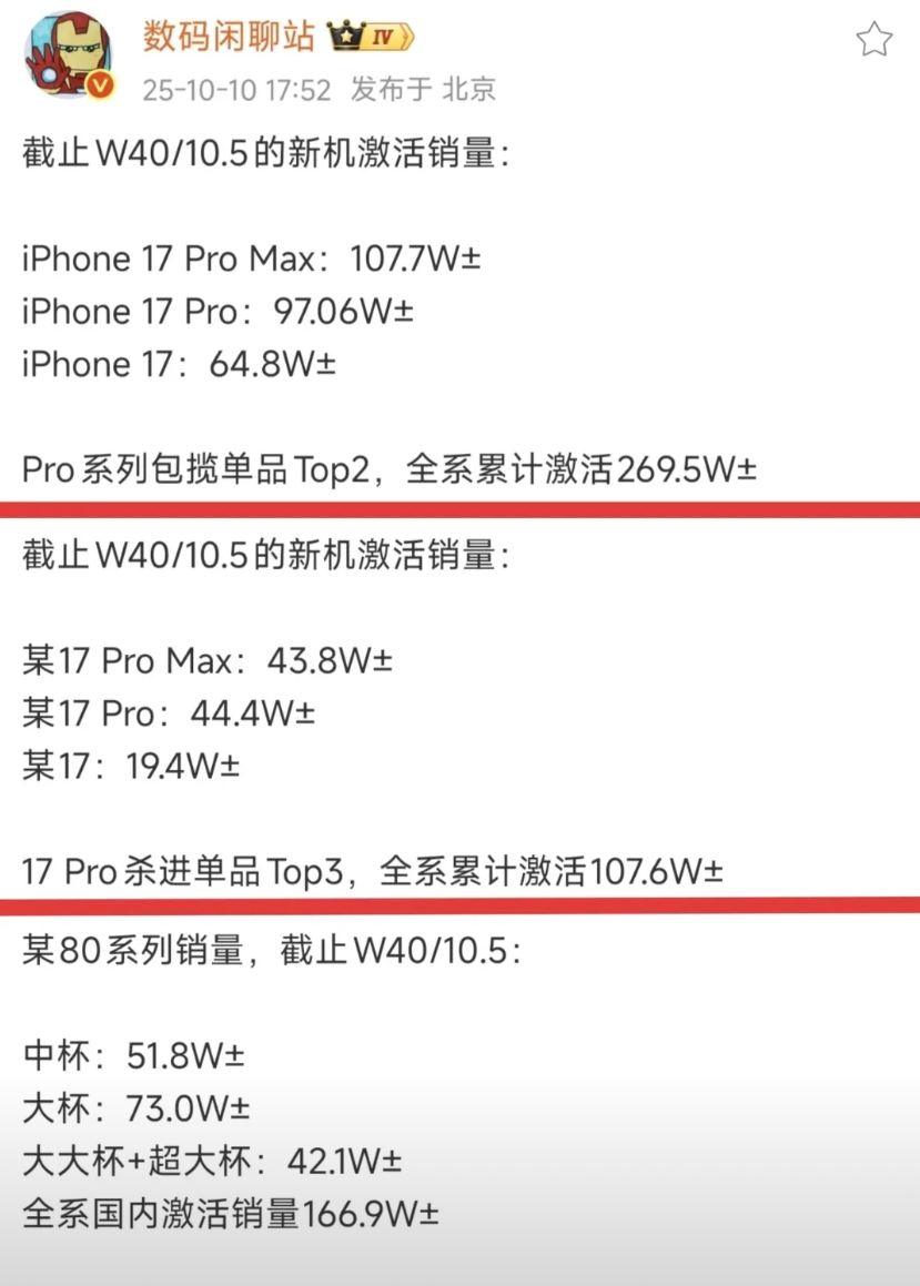 iPhone17系列激活量269万、小米17系列激活量107万、华为Pura80系列激活量166万、Mate70系列激活量795万!