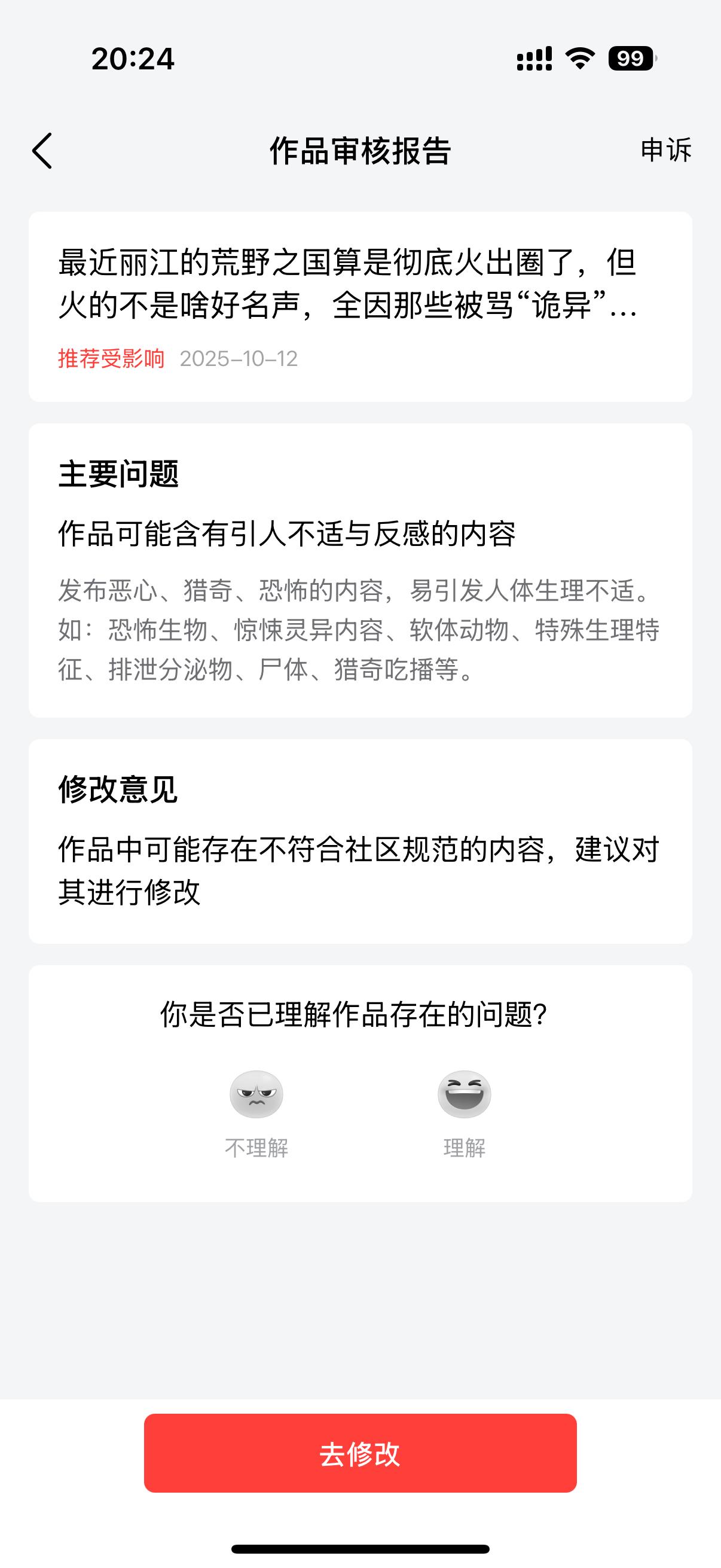 头条又提示我了 说我的作品推荐受影响 作品可能含有引人不适与反感的内容 申诉了不