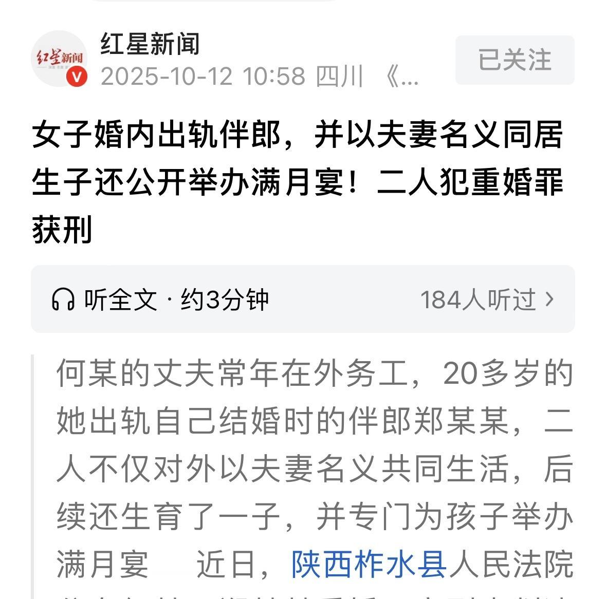 陕西商洛,男子为了赚钱养家,常年在外务工,20多岁的年轻妻子独自守家,却和当初婚礼上的伴郎看对了眼,2人光明正大同居,对外宣称是两口子,还生下一子,甚至大张旗鼓为孩子办满月宴,对于这些,男子一直被蒙在鼓里毫不知情,就在2人以为小日子能一直这样过下去时,一件事还是让他们露了馅。 老程为了养家,常年在外地工地上干活,他年轻的妻子何某则留在了老家。 哪曾想,这一出门挣钱,家里直接变了天。 2019年底,老程和何某低调办了喜事,领了红本本。婚礼上,老程请来自己的好兄弟郑某某当伴郎。 到了2020年,老程又出门务工,家里就剩下何某一个人守着,偶尔会和郑某某走动。 日子一长,何某和郑某某的关系就变了味。更离谱的是,他俩居然对外公开以“两口子”的身份过起了日子,这让街坊邻居都以为他俩是正经夫妻。 郑某某呢,明明知道何某是有老公的人,可他还是选择了和她一起生活。 这种不清不楚的日子过了两年多,到了2022年12月,一个男婴降生了,而这孩子正是何某和郑某某生的。 医院里,何某生孩子的时候,郑某某更是以“丈夫”的身份,大模大样地在那些需要家属签字的同意书、委托书上签下了自己的名字。 这操作,更是坐实了他俩对外夫妻关系的身份。 孩子出生后两个月,也就是2023年2月,何某和郑某某更是毫不避讳地在一家饭店,热热闹闹地给孩子办了个满月宴。 何某这边的亲戚来了,郑某某的老父亲也来了,大家推杯换盏,场面看着挺喜庆。不知道内情的,还真以为这是一家三口的喜事。 孩子出生后,一直跟着何某生活,吃的穿的用的,所有开销都由郑某某负担。 然而,纸终究包不住火,郑某某自己先栽了。 2023年3月,他因为犯非法狩猎罪,被判了十个月的有期徒刑,被关进了监狱。 这一进去,他和何某这种不正当的关系,自然也就断了。 公安机关介入后,他们俩的关系也露馅了,何某和郑某某倒老老实实地交代了他们之间发生的所有事情。包括以夫妻名义同居,包括生孩子,包括办满月宴。 老程这边呢,得知这件事后也是难以置信,好兄弟和自己老婆搞一起去了,还同居生了娃,这事搁谁身上都受不了。 后来这案子到了法院,那么从法律角度,怎么看待这件事? 《刑法》第258条规定:有配偶而重婚的,或者明知他人有配偶而与之结婚的,处二年以下有期徒刑或者拘役。 何某于2019年12月与程某登记结婚,婚姻关系合法存续。自2020年起,何某在明知自己已婚的情况下,与郑某某以“夫妻名义”对外共同生活,并生育一子。这种行为突破了法律对“一夫一妻”制度的保护,构成“事实重婚”。 郑某某作为婚礼伴郎,明知何某与程某的婚姻关系,仍选择与何某以夫妻名义共同生活,并承担孩子生活费用,构成“明知故犯”的重婚共犯。 法官的看法也很明确,认为何某和郑某某的行为已经构成重婚罪,必须得依法处理。 检察院在起诉时也说了几点关键情况:第一,何某和郑某某都认罪认罚,态度比较好;第二,他俩都是主动投案,属于“自首”,依法可以从轻考虑;第三,何某以前没犯过事,是初犯;但郑某某不一样,他有犯罪前科;第四,考虑到他俩的家庭情况,特别是孩子还小需要抚养。 综合这些,检察院建议给何某判一年有期徒刑,但可以缓刑,并给郑某某判十个月有期徒刑,也可以试试缓刑。 在法庭上,何某和郑某某都表示认罪认罚,对检察院指控的事实和罪名都没意见。他们请的律师也对事实和罪名没异议,同意检察院提出的量刑建议,尤其是希望法院能同意给他俩判缓刑。 法院最终怎么判的呢?法官们根据查明的所有事实,结合法律和人情,做出了决定。 首先是何某,法院认可她认罪认罚、主动自首的情节。更关键的是,她生的那个孩子年纪太小,现在跟着她生活,需要母亲照顾。社区矫正机构那边也同意接收她进行社区矫正。 所以,法院采纳了检察院和律师的意见,同意给她缓刑。最后何某被判处有期徒刑一年,缓刑两年执行。 也就是说,只要在两年缓刑考验期内表现良好,遵守规定,就不用真的去坐那一年的牢了。 郑某某这边,法院也认可他认罪认罚、主动自首的情节,同意对他从宽处罚,但是,法院强调了关键的两点:第一,郑某某以前就犯过事,有前科;第二,社区矫正机构经过评估,不同意接收他进行社区矫正。 这就意味着,对他适用缓刑的条件不具备了,所以,法院拒绝了检察院和律师关于给他缓刑的建议。 最后,法院判郑某某有期徒刑十个月。 对此,你怎么看? 关注@运良说法 学法律知识不迷路