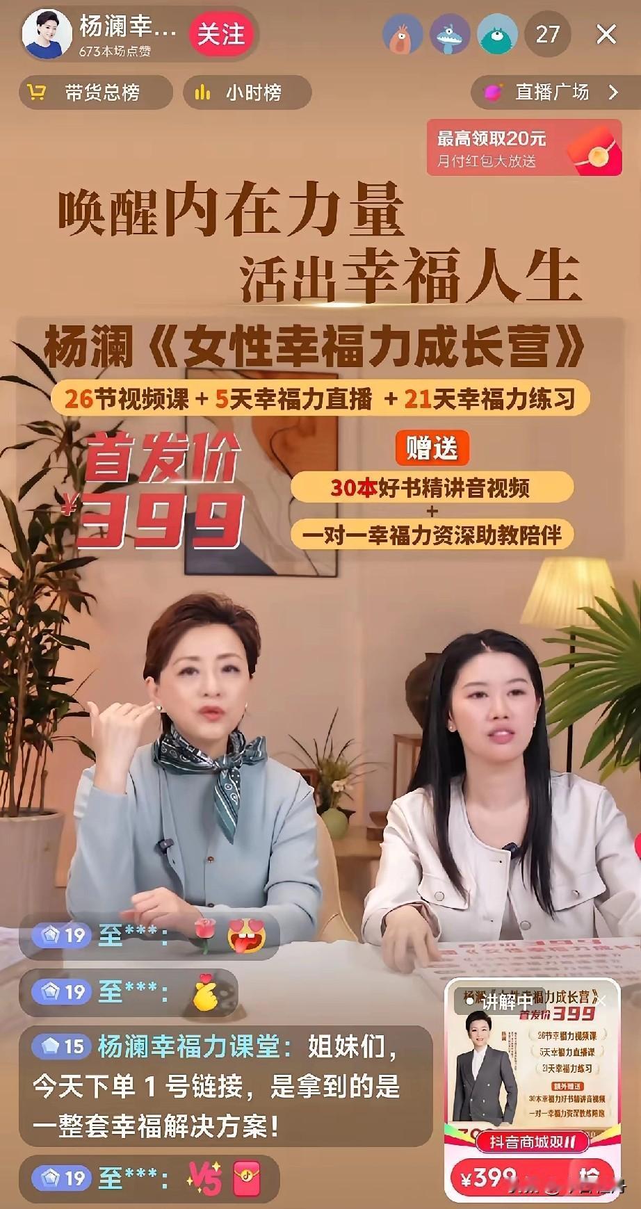 杨澜今天直播一天了,在直播间卖她写的书399元,看到直播间人越来越少,有20个人