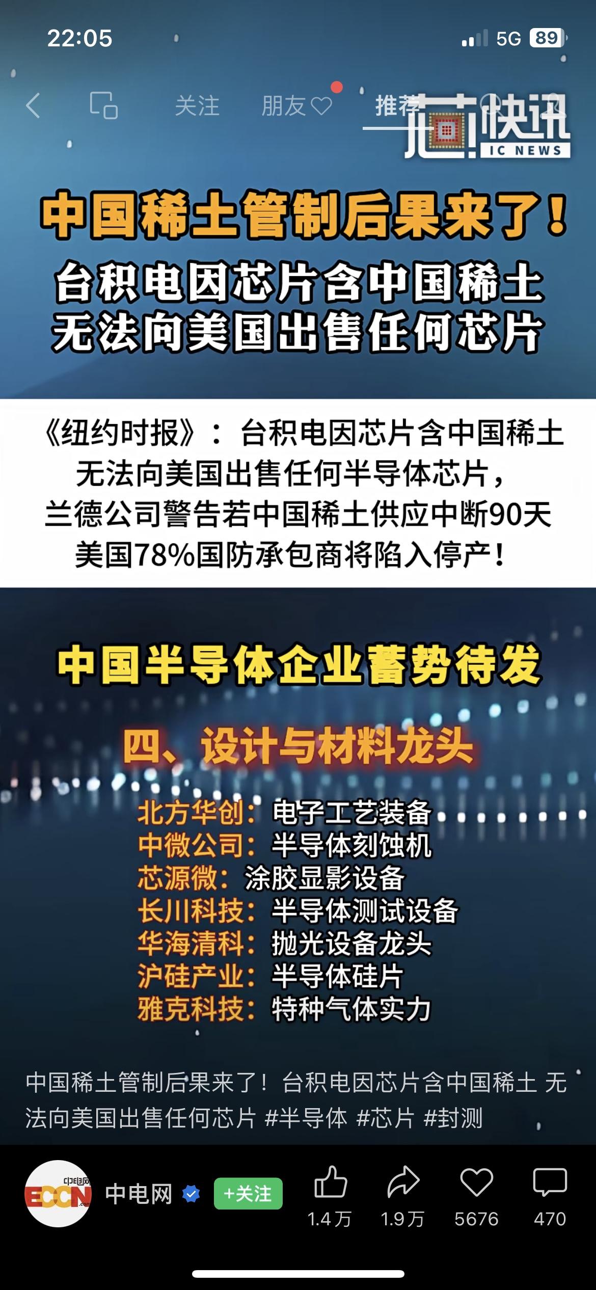 中国稀土管制有新动态!台积电因芯片含中国稀土,无法向美国出售芯片,咱们来看看这事儿 家人们,最近稀土管制有了新进展!据《纽约时报》报道,台积电因为芯片里含有中国稀土,没办法向美国出售任何半导体芯片了。另外,兰德公司还警告说,如果中国稀土供应中断90天,美国78%的国防承包商都会陷入停产。 从市场角度看,稀土是半导体等产业的重要原材料,这次的情况也让咱们把目光投向了中国半导体企业。像封测领域的长电科技、通富微电;设计领域的海光信息、兆易创新;制作领域的中芯国际、华虹公司;还有设计与材料领域的北方华创、中微公司等企业都在蓄势待发。 从客观角度来说,这类产业关联事件往往会引发市场对相关板块的关注,但具体的走势还是要结合多方面因素来看。 你怎么看待稀土管制和半导体产业的这波动态?来评论区聊聊。 本文仅为市场信息解读,不构成任何投资建议,据此操作风险自担 A股热点 稀土管制 半导体产业中国对美稀土 稀土出口限制 中方稀土战略