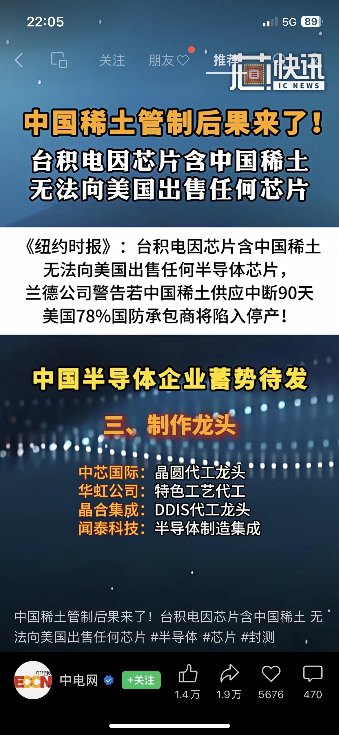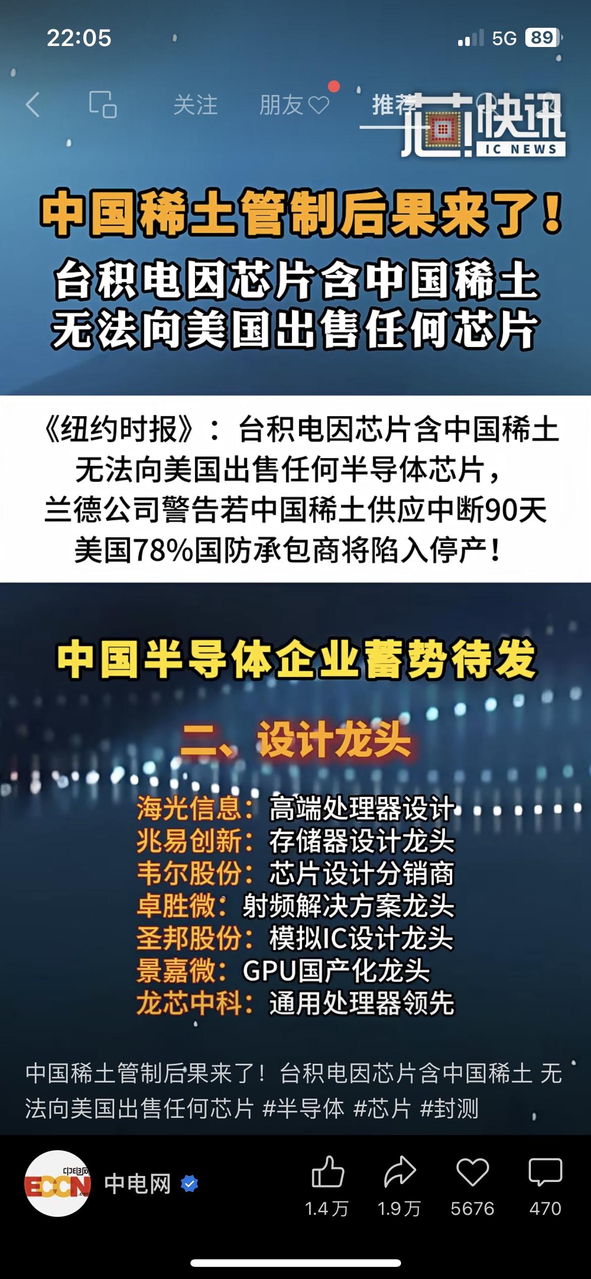 中国稀土管制有新动态!台积电因芯片含中国稀土,无法向美国出售芯片,咱们来看看这事