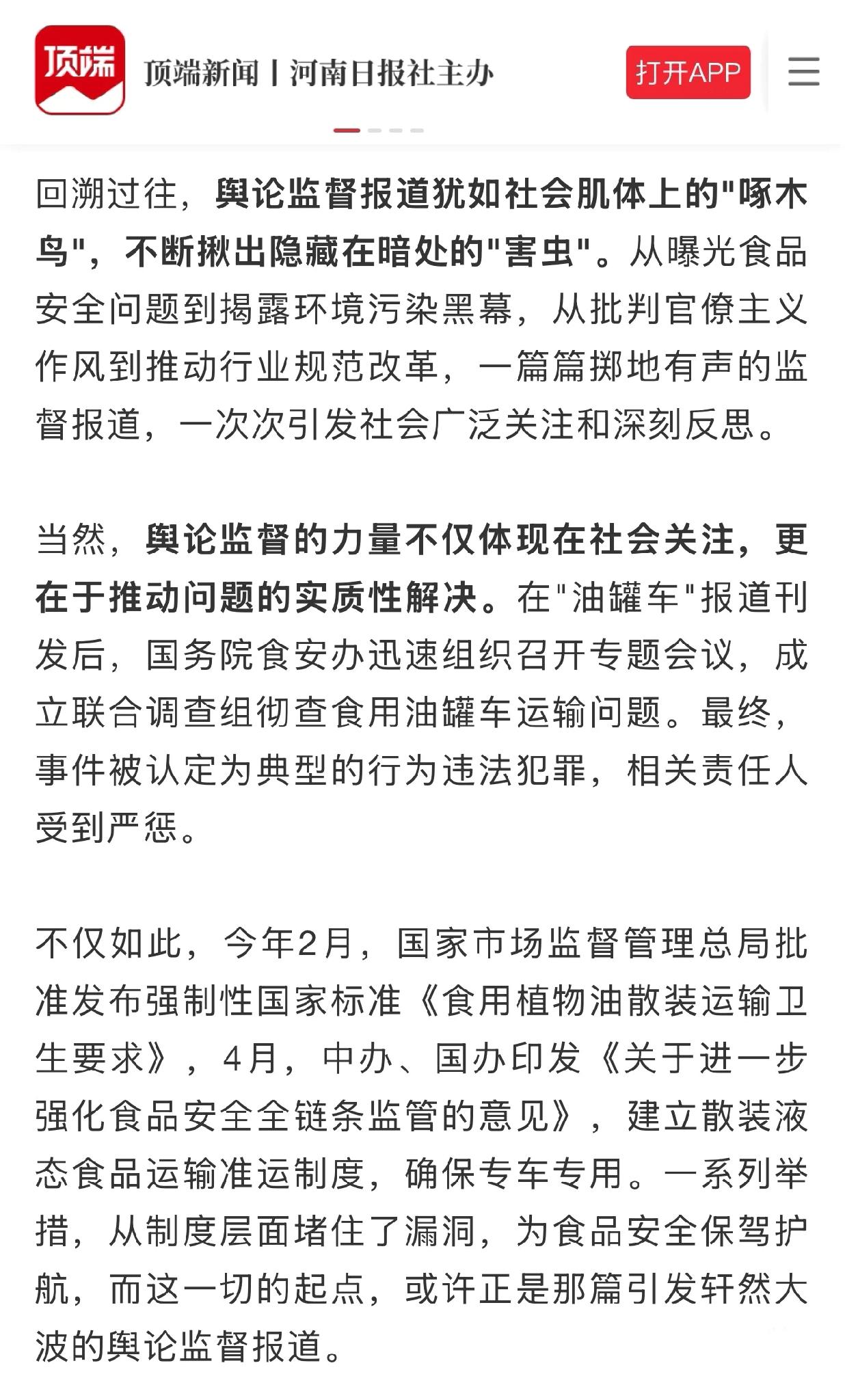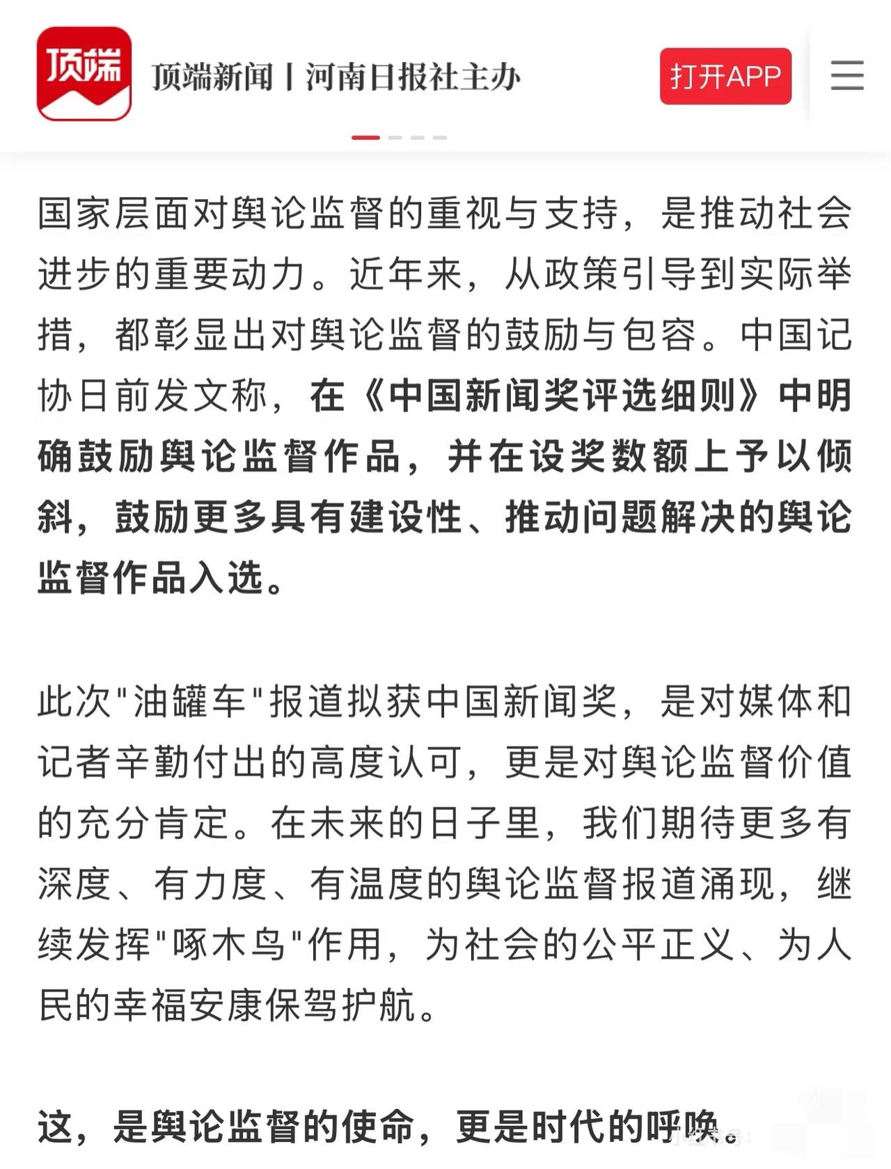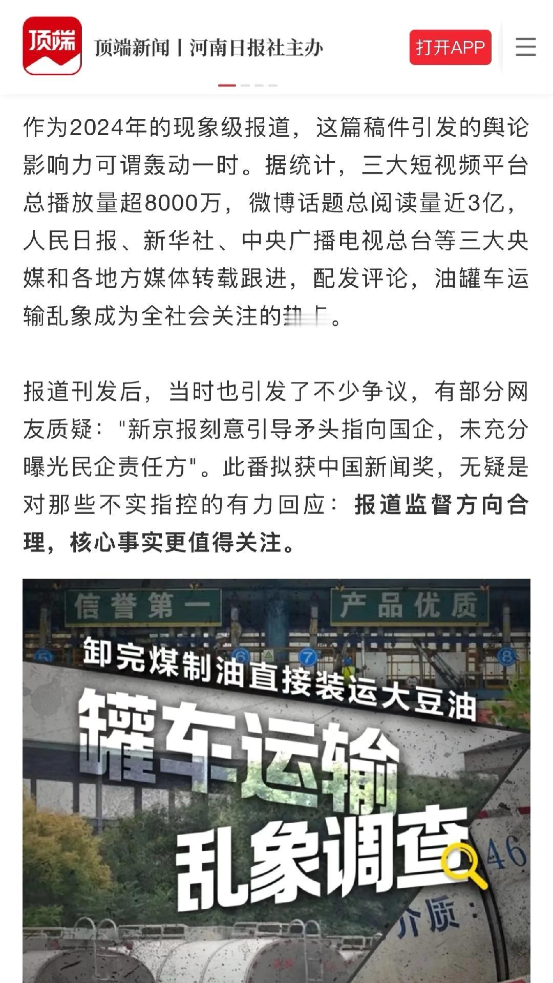 国家开始支持舆论监督了吗? 昨天看到,中国记协公示了第35届中国新闻奖评选结果,去年新京报的重磅报道《罐车运输乱象调查:卸完煤制油直接装运食用大豆油》拟获舆论监督报道一等奖。 当时不少网友质疑:“新京报刻意引导矛头指向国企”,现在来看也是对那些不实指控的有力回应:报道监督方向合理,核心事实更值得关注。 还挺高兴的,从侧面体现了国家层面对舆论监督的重视,所以我在顶端新闻发了这篇。