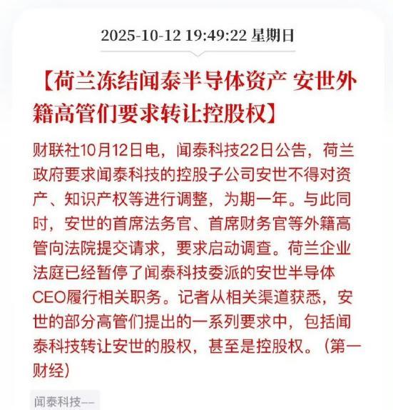 西方开始抢劫中国的资产了吗? 10月12日,闻泰科技公告,荷兰政府要求闻泰科技 转让安世的股权,甚至是控股权。 一百多年前,西方这些国家,抢走了中国的财产, 一百年后的今天,西方国家仍然准备这样做! 我们必须清醒认识到:西方国家的强盗逻辑从未改变。他们见不得中国高科技产业崛起,想尽办法要遏制我们发展。从之前美国无理制裁,到现在荷兰公然抢夺,手段一个比一个下作。 闻泰科技可不是什么荷兰企业,而是我国的半导体巨头,行业内的领军企业!而安世半导体可是闻泰科技在2019年全资收购的子公司,完全是中国资本控股。 荷兰政府却明摆着要把中国企业在海外的资产生生抢走!这一出,简直是把国际商业规则踩在脚下。他们找的理由看似冠冕堂皇,说什么“防止资产和知识产权被调整”,但实际干的事情却是暂停中方董事职务,任命拥有决定性投票权的外籍董事,还把中资股权压缩到只剩1股。这不是明抢是什么? 一百多年前,西方列强不就是这么欺负我们的。如今他们换了身行头,打着法律的旗号继续干着掠夺的勾当。安世半导体去年营收高达147亿元,在全球半导体行业举足轻重。荷兰政府这一出手,就是要掐住中国半导体产业的脖子。 中国企业走出去不容易,面对小人的明枪暗箭,我们既要据理力争,也要加快自主创新。只有把核心技术牢牢掌握在自己手中,才不怕任何人卡脖子。 而荷兰政府这次的行为,给所有中国企业敲响了警钟:在海外投资,不仅要遵守当地法律,更要提防这种披着合法外衣的抢劫! 有人说荷兰在华投资也不少,等价没收就是了,不过是以其人之道还治其人之身。他们先过界,就别怪我们做的太狠! (每天更新,欢迎关注,喜欢文章的可以帮忙点个赞留条评~) 对此大家有什么看法?