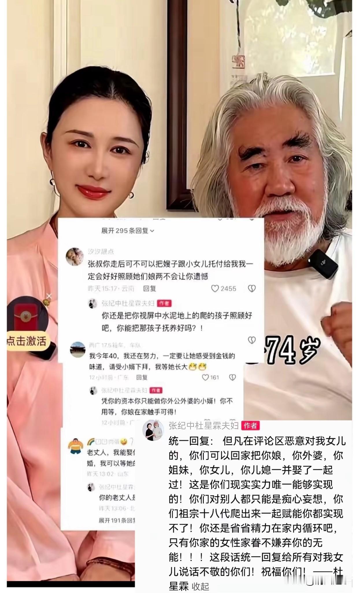 一觉醒来吃瓜吃到目瞪口呆! 张纪中夫妇的回应引起了网友的强烈不满 甚至有网友说张纪中夫妇的回应就是典型的"狼狈为奸""脸皮厚"...... 张纪中夫妇的回应究竟做错了什么,居然让网友有这么大的火气? 网友表示:张纪中夫妇的言辞太恶劣了,太不把观众当回事了,太不尊重他人了,太没有素养了,太不给我国传统文化面子了,太违背社会主义核心价值观了! 要是张纪中夫妇说的是玩笑话,那就是个低级的笑话,要是张纪中夫妇说的不是玩笑话,那就是恶劣的流氓行为! 相比之下,张艺谋夫妇就是典范,而且夫妇二人低调稳重,教育出来的子女也非常优秀!再说张纪中妻子,以前就有多段婚姻,被网友扒皮,说她就是个"惯贼",喜欢"顺手牵羊",多次婚姻不都是为了追求金钱财色吧!现在又嫁给张纪中,就是看中张纪中的名气和钱财吧!如此这般,居然还想当贤妻良母,真是可笑至极! 网友呼吁:应该封堵张纪中夫妇及其妻子的所有平台,让他们无法发声,让他们消失在公众视野,让他们无法糟蹋社会风气!