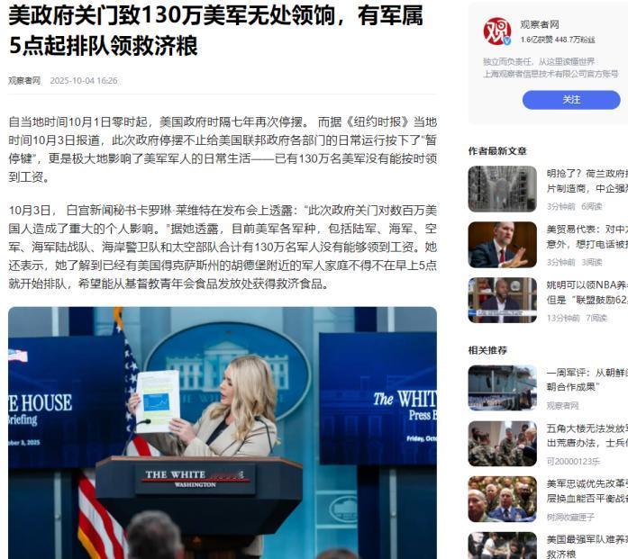 白宫新闻发言秘书莱维特传出来一极度令人振奋的个好消息!她说由于美国政府停摆,导致130万美军现在工资发不出来,很多美军士兵现在等着基督教的救济过日子,甚至美军士兵的家属,他们也在排着队去等待教堂的施舍。 这事说穿了,全是国会山两党为军事预算掐架掐出来的烂摊子。9月30号本该通过的临时拨款法案卡了壳,说到底就是两拨人在国防开支的算盘上根本谈不拢。 共和党攥着国防部9800亿美元的军费清单不松口,非要硬塞200亿美元边境墙拨款,还放话要砍掉对乌克兰的部分军事援助;民主党则咬死边境拨款不合理,反过来要求追加150亿军人福利开支。 两边在国会吵了三周,连个过渡性的拨款方案都没谈成,直接让联邦政府按下了停摆键——毕竟在政客眼里,争赢政治立场可比130万美军的生计重要多了。 130万现役美军里,80多万基层士兵本就靠月薪扛着家庭开支,剩下的预备役连兼职津贴都没了着落。 北卡罗来纳州布拉格堡基地的一名陆军中士,最近成了媒体报道里的典型:全家四口房租还差三天到期,工资卡空空如也后,只能带着妻子去附近的圣约翰教堂领救济包,里面的罐头和麦片撑得了一周,可孩子的奶粉还得四处借。 这不是孤例,得州胡德堡基地外的几所教堂,最近每天清晨七点就排起长队,家属们抱着纸箱等尿布、面包,教堂牧师说周末单日援助的家庭数,比上个月翻了三倍——曾经喊着“保卫自由”的美军家属,如今要靠宗教救济过日子,这画面说出去都嫌丢人。 两党掐架早不是单纯的数字之争,更像是拿军费当政治筹码。共和党要把12%军费砸进新型导弹研发,还想砍50亿军人医疗补贴;民主党则盯着退伍军人安置和家属住房保障要预算,两边都把“为美军好”挂在嘴边,却没人真去基地看看士兵的难处。 更讽刺的是,停摆前国会刚通过《军人荣誉法案》,满篇都是对美军的赞美,转头就因预算分歧让士兵陷入财务危机。 有数据显示,美军士兵中原本就有34%存在财务压力,停摆后这比例直接飙到67%,不少人偷偷去送外卖、代驾,甚至有人敢变卖军用装备上的非涉密零件——总不能看着家人饿肚子吧? 军事基地的运转也跟着掉链子。加利福尼亚州彭德尔顿军营的食堂缩了供应时段,原本免费的士兵早餐改成自费,基地医院常规体检全停,只能处理急诊。 士兵们的房贷、车贷催款短信一条接一条,银行虽承诺暂缓催收,可逾期罚息还在涨。华盛顿的“美军救济协会”紧急拨了500万美元应急,可分摊到130万人头上,每人还不到40美元,这点钱连孩子一周的奶粉钱都不够,纯属杯水车薪。 教堂倒成了意外的“救命稻草”。华盛顿圣马修大教堂一周内接了23家企业捐赠,每天发200多个救济包,不光有吃的,还有儿童书籍和卫生用品;得州一家浸礼会教堂干脆开通小额现金援助,每个士兵家庭能领300美元。 牧师接受采访时忍不住吐槽:“国会山的老爷们算军费的时候精于算计,倒把保家卫国的士兵晾在一边,最后要靠上帝的信徒收拾烂摊子。”这话在社交媒体上炸了锅,有人晒出士兵排队领救济和两党议员在国会互骂的对比图,配文“美国的优先级真是魔幻”。 两党其实早知道停摆的后果。参议院军事委员会之前收到过报告,明确说停摆超10天,美军训练效率会降40%,家属焦虑还会影响士兵战斗力。 可没人愿意先让步,共和党拿边境安全数据当挡箭牌,民主党揪着军人福利不放,电视节目上唇枪舌剑,记者问“士兵怎么生活”就绕着走。 更有意思的是,停摆期间国会山议员的薪资一分没少,照样拿日均500美元补贴,跟在教堂排队的士兵家属比起来,简直是两个世界。 随着停摆进入第三周,救济资源也快扛不住了。芝加哥有家教堂宣布救济包减半,因为捐赠跟不上需求;西雅图的“军人之家”搞众筹,三天才筹80万,离500万目标差得远。 有退役少将在专栏里写:“我们总吹美军是世界最强,现在连士兵温饱都要靠教堂,这不是笑话吗?”这话戳中了很多人,给士兵发工资话题阅读量破20亿,可国会的争吵还没停。 说到底,这根本不是军费够不够的问题,而是两党都想拿预算换选票。共和党想靠边境墙拨款讨好保守派,民主党要靠军人福利巩固支持率,130万美军的生计,不过是博弈里的牺牲品。