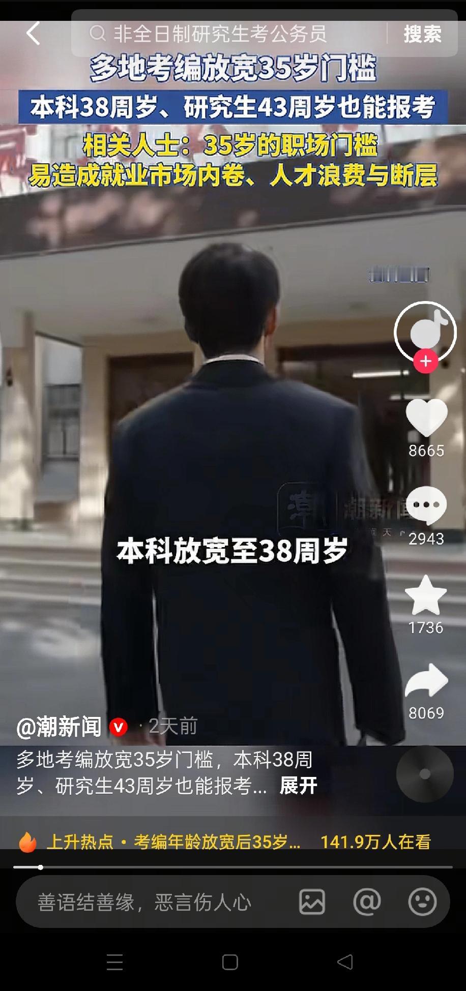 打破“35岁天花板”,年龄不再等于职场危机 “本以为这辈子没机会了,没想到政策放宽了!”一位38岁的考生激动地说。 谁能想到,临近不惑之年,她还能捧上“金饭碗”?近期,四川、上海、江苏等地相继放宽考编年龄限制,让无数“超龄”考生重拾希望。 这不仅是报考年龄的数字变化,更是对“35岁危机”这一社会痛点的温柔回应。当越来越多的城市加入这一行列,我们看到了怎样的社会变迁? 01 年龄之门,正在缓缓打开 今年秋天,一则招聘公告在四川考生的朋友圈刷屏了。眉山、遂宁等地将事业单位招聘年龄放宽至本科38周岁、研究生43周岁。 这让人想起去年山东某县招聘时,要求45周岁以下的新闻曾引发热议。当时不少人直呼“不敢相信”,如今看来,那竟是改革的先声。 一位报考者打了个生动的比方:“这就像赶火车,本以为已经停止检票,却突然听到广播说延长了时间。” 更暖心的是,遂宁还对退役军人额外放宽2岁。这样的精细设计,让人感受到政策不是“一刀切”,而是真正考虑了不同群体的需求。 02 打破“35岁魔咒”,社会在进步 “35岁找工作嫌老,65岁退休嫌早”——这句顺口溜道出了多少人的辛酸。 在职场打拼多年的人都有这样的体会:35岁本该是经验丰富、处事成熟的黄金期,却在求职时成了“烫手山芋”。这好比让一个运动员在状态最佳时提前退役,实在是人才资源的巨大浪费。 中央党校教授竹立家点出了问题的关键:这个年龄段的人才既有经验又有能力,正是干事创业的好时候。把这些人挡在门外,无异于捧着金碗讨饭吃。 如今政策转变,不仅是对人才的珍惜,更是与社会发展趋势同频共振。随着延迟退休政策的推进,放宽考编年龄可谓水到渠成。 03 一缕阳光,照亮中年职场路 这一政策调整,温暖了无数职场人的心。 在互联网公司打拼十多年的王先生坦言:“看到消息时,我反复确认了三遍。”今年37岁的他,正面临着行业调整带来的职业危机。“这不仅是多了一次考试机会,更是给了我们重新选择人生的权利。” 更重要的是,公务员招录向来是就业市场的风向标。体制内率先打破年龄壁垒,无疑为民营企业树立了榜样。 这缕阳光照进的,不只是考编这条路,更是所有职场人对于公平就业环境的期待。当社会更看重能力而非出生年月,每个人都能在自己的时区里绽放光彩。 政策的温度,体现在每一个具体的人生转折处。当38岁的考生坐在考场,当43岁的硕士捧起录取通知书,这些画面正在悄然改变着我们对年龄的认知。 人生的精彩从来不拘泥于数字,而在于无限的可能。正如一位考生所说:“政策放开后,我感觉整个社会都在对我说:别急,你的机会还在后头。”