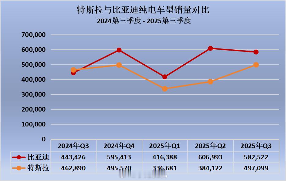 2025年Q3比亚迪纯电销量582522辆,较特斯拉497099辆交付量领先85423辆,自2024年Q4起已实现全球纯电销量四连冠,在全球电动车格局重塑中稳稳站定领跑位。前9月其新能源总销量326万台,纯电车型贡献近160.6万台,占比49.26%,成绝对销量支柱。