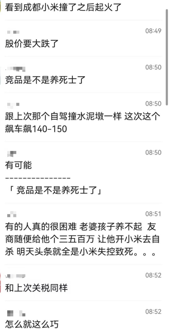 事故什么原因还没有出结果,但是已经有死忠粉把问题帅甩锅给友商了,认为出事的车主是友商养的死士,这言论是真的太逆天了,对逝者一毛钱的尊重都没有。当然,我希望这群聊截图最好是假的,不然这个群体真的太可怕了……
