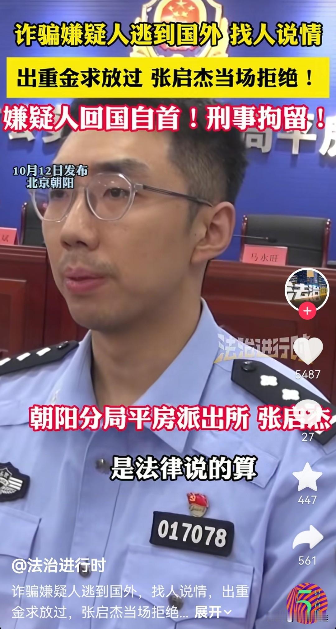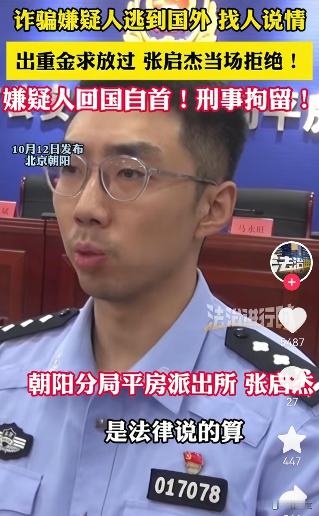 [笑哭][笑哭]诈骗嫌疑人逃到国外,找人说情,出重金求放过,张启杰当场拒绝!嫌疑人回国自首!刑事拘留!