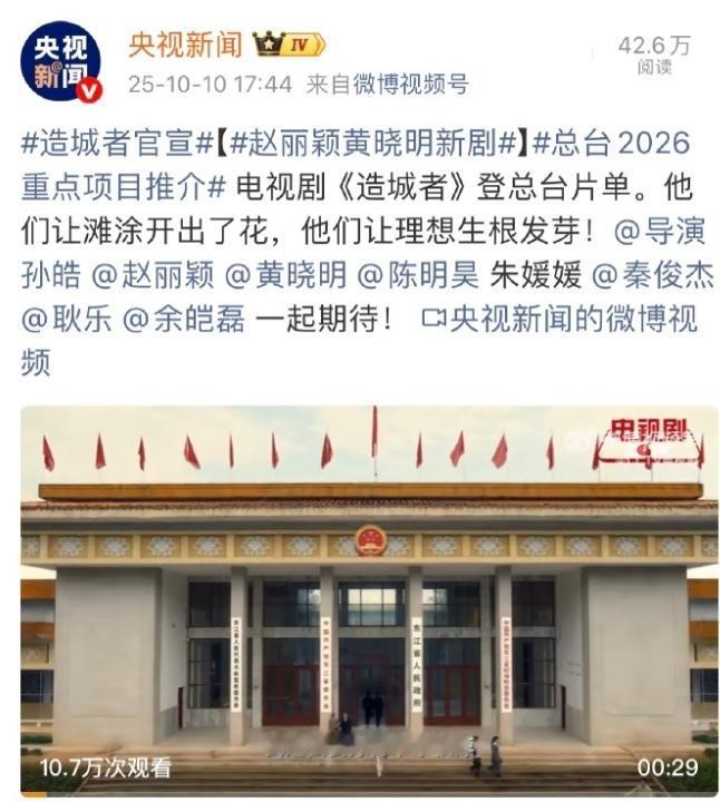 央视对《造城者》确实不太一样 中午官宣了总台重点推荐项目,一次性官宣了《主角》,《太平年》,《生命树》,《伟大的征程》,到了下午单独官宣了《造城者》,还是视频官宣,如果这部剧在央视播出,那将是赵丽颖第一部首轮上星央视的作品,正式解锁她的央视收视实绩。