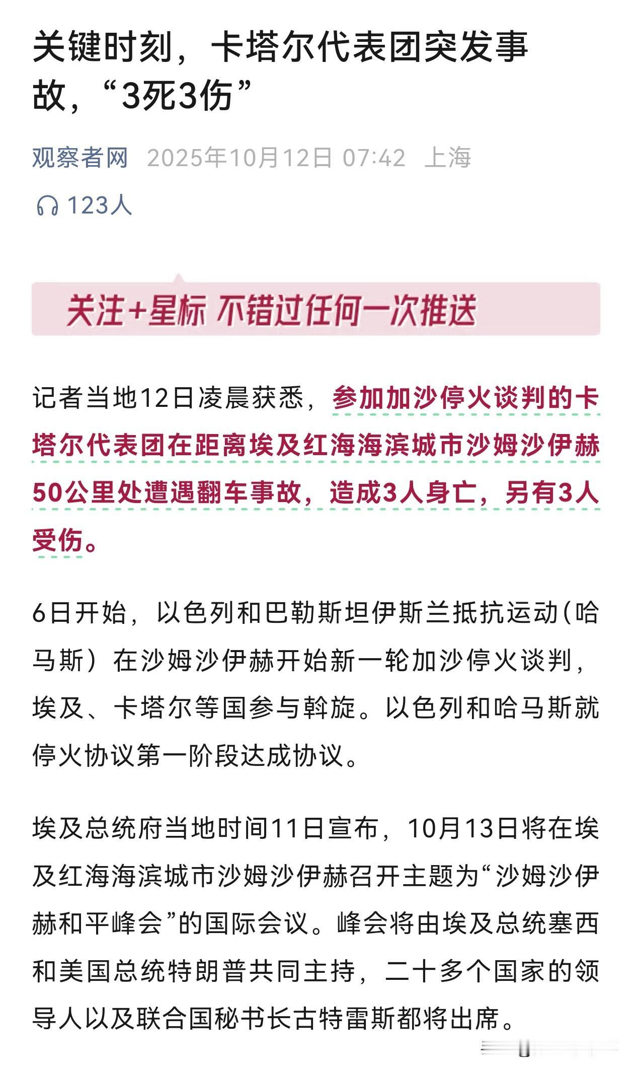 停火协议刚签,调停者就丧命? 没错,谁干的?答案显而易见! 10月12日凌晨,参与加沙停火谈判的卡塔尔代表团在埃及沙姆沙伊赫附近遭遇翻车事故,3人丧命、3人受伤的消息,给所谓的"和平曙光"浇了盆冰水。 这事真能算单纯的意外?恐怕没那么简单吧。 卡塔尔可不是凑数的角色。 这个看似不起眼的小国,是这次停火谈判的核心推手之一,不仅协调哈马斯内部立场,往返十余次弥合分歧,还是协议联合声明发布方,更是被美方认可的"协议监督者"。 更关键的是,加沙公务员工资靠它支付,哈马斯高层也受其庇护,它的存在直接卡住了停火落地的关键环节。 巧就巧在时机太微妙。 10月8日以哈刚达成第一阶段停火协议,10日协议生效,12日调停核心力量就出了"意外",这时间线简直精准得可怕。 要知道,中东的和平进程里,"意外"从来都是消灭异己的惯用手段。 早在1948年,联合国巴勒斯坦调停者贝纳多特就被犹太武装分子蓄意暗杀,当时的手法也是预先设伏、精准射击。 背后的逻辑不难猜: 停火不符合某些势力的利益。 以色列打了两年仗,经济承压、政府失信,但强硬派绝不甘心就此收手; 还有势力不想看到卡塔尔借调停扩大影响力,更不愿中东出现真正的和平秩序。 干掉关键调停者,既能打乱协议执行节奏,又能制造恐慌震慑其他斡旋方,可谓一举两得。 哈马斯和阿联酋的哀悼声明透着无奈,卡塔尔使馆急着对接埃及调查的背后满是焦灼。 这场"车祸"撕开的,那是中东博弈最血腥的真相: 在这里,和平从不是靠谈判桌敲定的,而是靠实力较量出来的。 调停者的鲜血再一次证明,只要各方利益没真正平衡,所谓的停火不过是下一轮冲突的短暂间隙。 卡塔尔局势