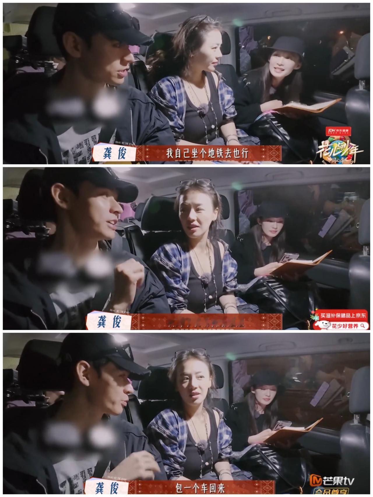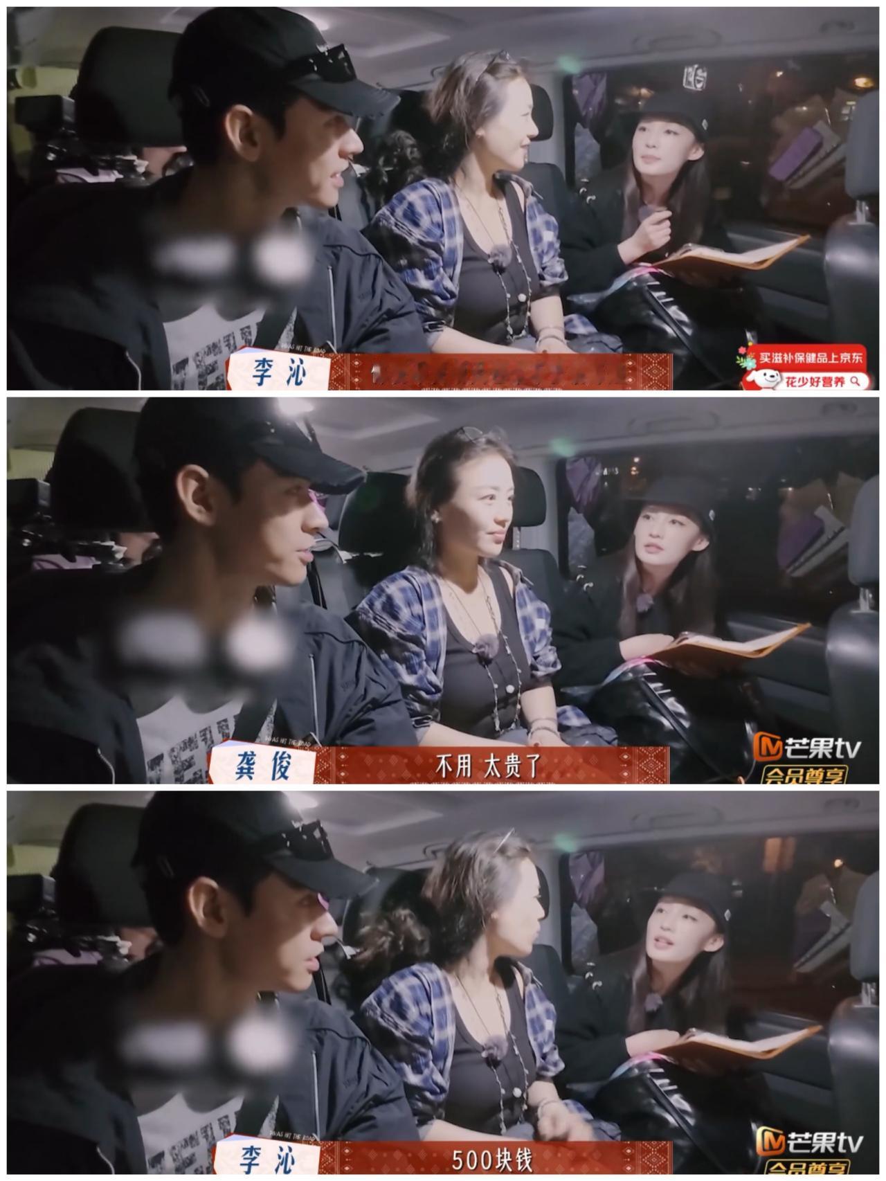 马思纯这一刻好希望在“车底”呀, 拜托龚俊和李沁快 放过马思纯。 龚俊,李沁商量明天的行程, 但是马思纯就坐在他们中间, 就这样他们隔着马思纯交流, 你一句,我一句, 马思纯完全插不上一句话, 十分尴尬, 只能看着他们微笑, 马思纯甚至有点 在第一线吃瓜的“姨母笑”的感觉。 甚至弯腰给他们让出空间, 假装没有她这个人的存在, 太调皮了。 李沁建议龚俊第二天包车去接那英, 但是龚俊死活不肯, 车费太贵了, 他坚持要坐地铁去, 接到那英后, 再包车回来。 李沁好心劝说, 龚俊就是不听, 但是李沁一点都不生气, 一直很温柔的继续劝说。 这个情景有点像 妈妈温柔劝爸爸包车去接亲戚, 但是爸爸为了省钱, 执意要坐公共交通工具, 妈妈还是不罢休, 一直在劝, 但是语气却一直很温柔。 哎呀, 龚俊为了节约经费, 自己受点苦就行。 可以坐地铁去接那英, 苦自己可以, 不能苦那英呀, 到了机场接那英, 一定要包车回来呀。 李沁和龚俊都是为别人考虑的人, 真的是从细节处看人品。