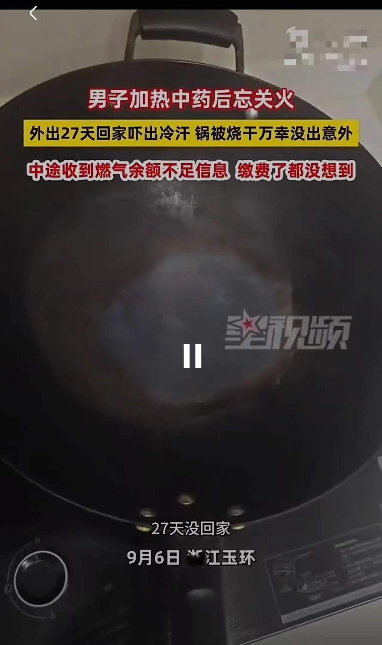 “腿都吓软了!”男子忘关火,27天后回家才发现!万幸的是,只有锅被烧干,没有引发