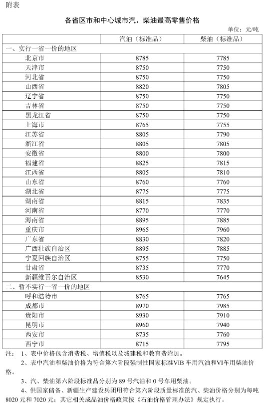 附:各省区市和中心城市汽、柴油最高零售价格