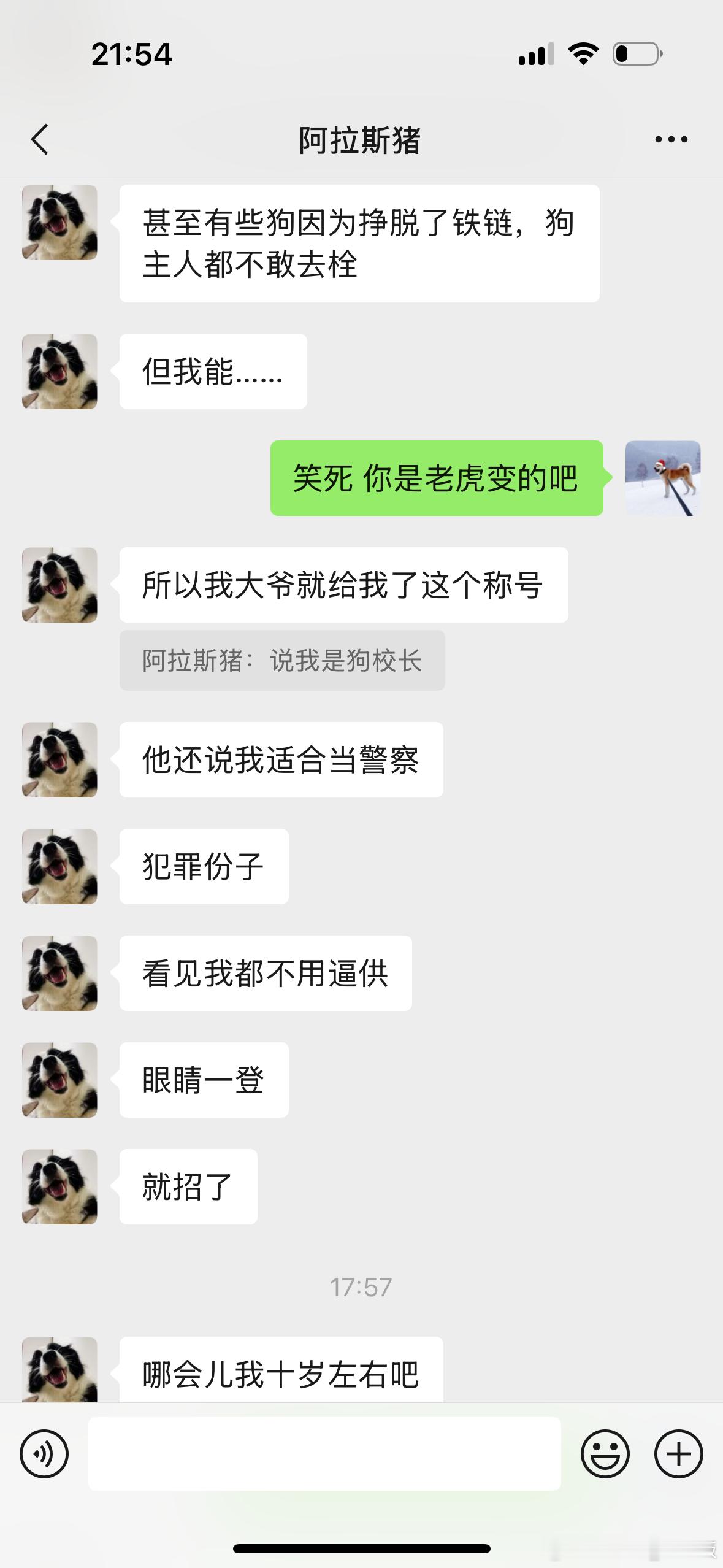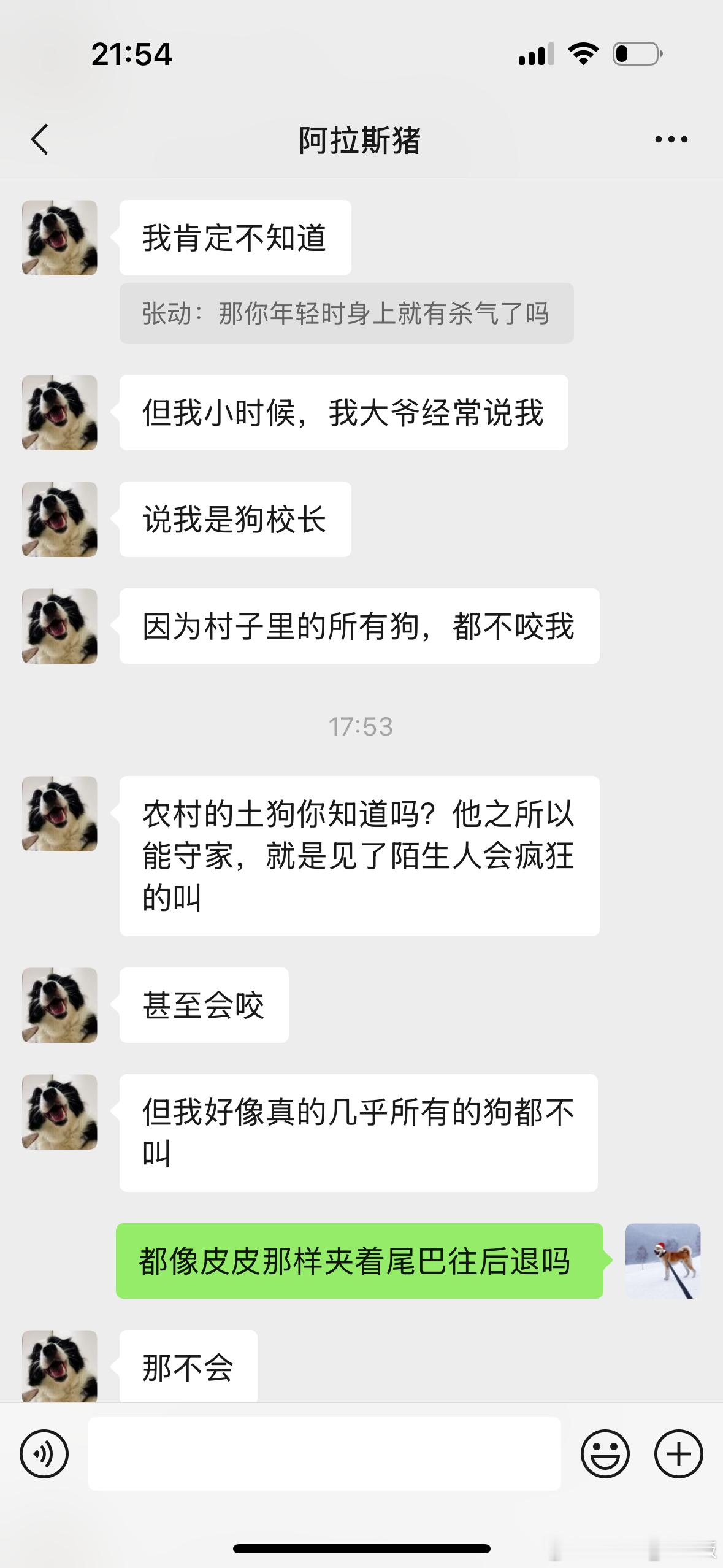 再就是我家皮皮,第一次见到他的时候,吓得脚直打滑。后来分开一两年没见,皮皮把他给忘了。昨天再次见面,狗子又像是见到了天敌,一直夹着尾巴往后退,怎么喊都不肯过来..