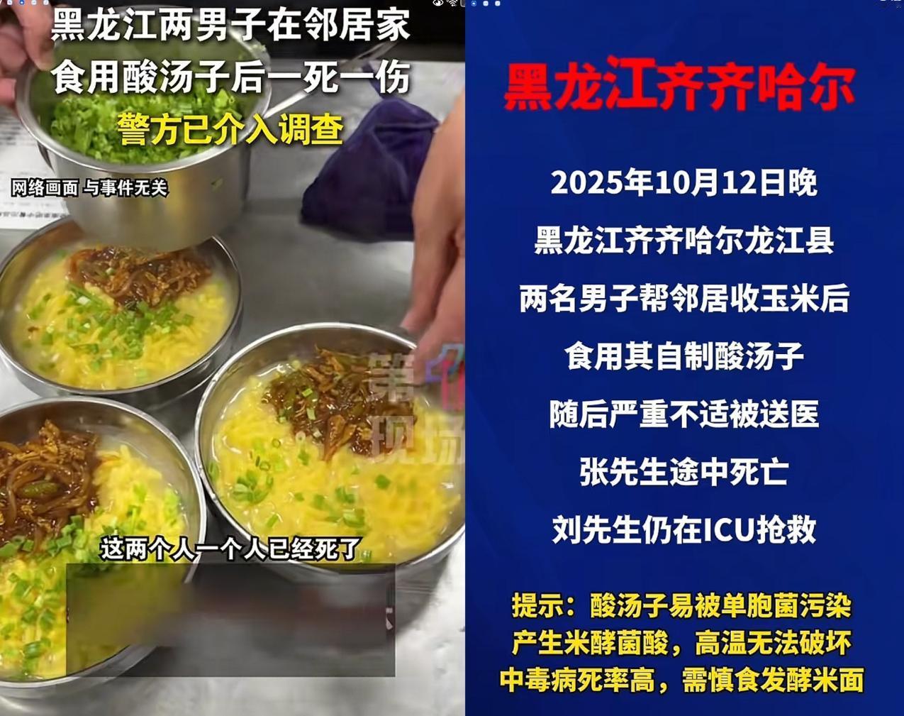 黑龙江齐齐哈尔的张某 好心帮邻居收玉米 邻居答谢弄了好吃的,结果却 出大事儿了。 10月12号 张某和亲戚刘某帮忙收完玉米 吃饭时邻居端上酸汤子。 两人吃了些 没多久就肚子疼得像肠子被猛拧 拉的还是黑便。主家吓坏送医 半路一人就没了 另一人进了重症监护室生死未卜。 酸汤子这特色美食 是发酵的玉米面面条 可它含大量黄曲霉素 吃多了后果严重。 就像咱唐山海虹 平时放汤好喝,夏天却会分泌毒素。 可见,美食虽好,安全更重要。 你们那有类似美食不?快来说说。