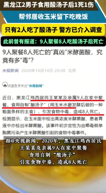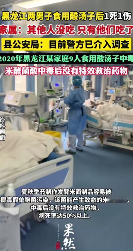 黑龙江,两名男子在邻居家吃了酸汤子后身体不适紧急送医,一人不幸离世,另一人正在急救,警方已经介入调查,死者家属“”一桌人只有他俩吃了,还没到医院人就不行了。 10月12日,黑龙江,天气已经转凉,齐齐哈尔市龙江县某村的玉米地里,一派忙碌的收割景象。 村里的张先生和亲戚刘先生想着邻里互相帮衬,就去给同村邻居搭把手收玉米。 忙活了一天,到了晚上,邻居想着感谢两人的帮忙,就留他们在家吃饭。 饭桌上摆了好几样菜,其中有一碗酸汤子,这是东北部分地区喜欢吃的一种食物,用发酵的面渣子做成,吃起来带着股独特的酸味。 谁都没料到,这一顿饭竟成了悲剧的开端。 饭后没一会儿,张先生和刘先生两人就觉得身体不对劲,开始出现不舒服的症状,脸色也变得难看。 邻居一看不对劲,赶紧喊人找车送医院。 在去医院的路上,车里的人都揪着心,不停给张先生擦汗、喊他名字,可他还是在半路上没了气息。 刘先生撑到了医院,直接被推进了ICU,至今还没脱离危险。 事情发生后,张先生的小舅子周先生是13号一大早接到家里电话才知道的,听到姐夫不在的消息,他心里又急又痛。 他赶去医院时,只看到姐夫的遗体被安置在太平间,姐姐哭得瘫倒在地。 龙江县人民医院的急诊护士说,12号晚上确实收了这两位病人,其中一位到院时已经没有生命体征,另一位还在ICU抢救,具体情况不方便对外说。 当地警方接到报警后,很快就到村里调查。 他们查了当天的饭菜、询问了一起吃饭的人,最后把目光锁定在那碗酸汤子上。 确定是这碗被污染的酸汤子,导致两人中毒。 不过,这酸汤子是谁做的,做了多久,一直放在哪儿,这些关键问题还在查,后续还要对张先生的遗体做法医鉴定,彻底弄清楚中毒的细节。 说起酸汤子中毒,不是第一次发生了,早在2020年,黑龙江鸡东县就发生过一起9个人吃了自制的酸汤子后8人中毒去世的惨剧。 后来查清楚,那次的酸汤子是因为在冰箱里冷冻了快一年,拿出来吃之前又在室温下放了一段时间,才被一种叫椰毒假单胞菌的细菌污染。 这种细菌会产生米酵菌酸,高温都没办法破坏它的毒性,而且现在还没有能解这种毒的特效药,一旦中毒,活下来的可能不到一半。 这件事在网上传开后,网友们都炸开了锅。有网友说:“5年前鸡西那9个人的事儿还记着呢,怎么还有人不注意啊,太可惜了!” 还有网友注意到细节,说“一起吃饭的就他俩吃了酸汤子,明摆着就是这食物有问题”。 还有网友分享自己的经历,说以前家里老人也做过酸汤子,那时候叫“臭米面子”,吃之前都会先让家里的狗尝一口,狗没事了家人才敢吃,现在想想,真是有点后怕。 很多类似的发酵食品,都存在被污染的风险,尤其是在夏秋季节,天气又潮又热,制作和储存这些食物的时候,特别容易被有害菌盯上。 要是不小心吃了被污染的,一般在2到24小时内就会出现恶心、呕吐、头晕的症状,严重的话还会损伤肝、脑、肾,最后危及生命。 现在,刘先生还在ICU里和死神抗争,张先生的家人还沉浸在失去亲人的痛苦中。 一场原本充满温情的邻里宴请,最后却变成了天人永隔的悲剧。 这事儿也提醒着大家,平时吃这些发酵食品的时候,可得多留个心眼,能不吃就尽量不吃,要是实在想吃,也得从正规渠道买,也别长时间存放。 一旦感觉身体不舒服,像是吃坏了东西,赶紧催吐,然后去医院,千万别耽误时间。