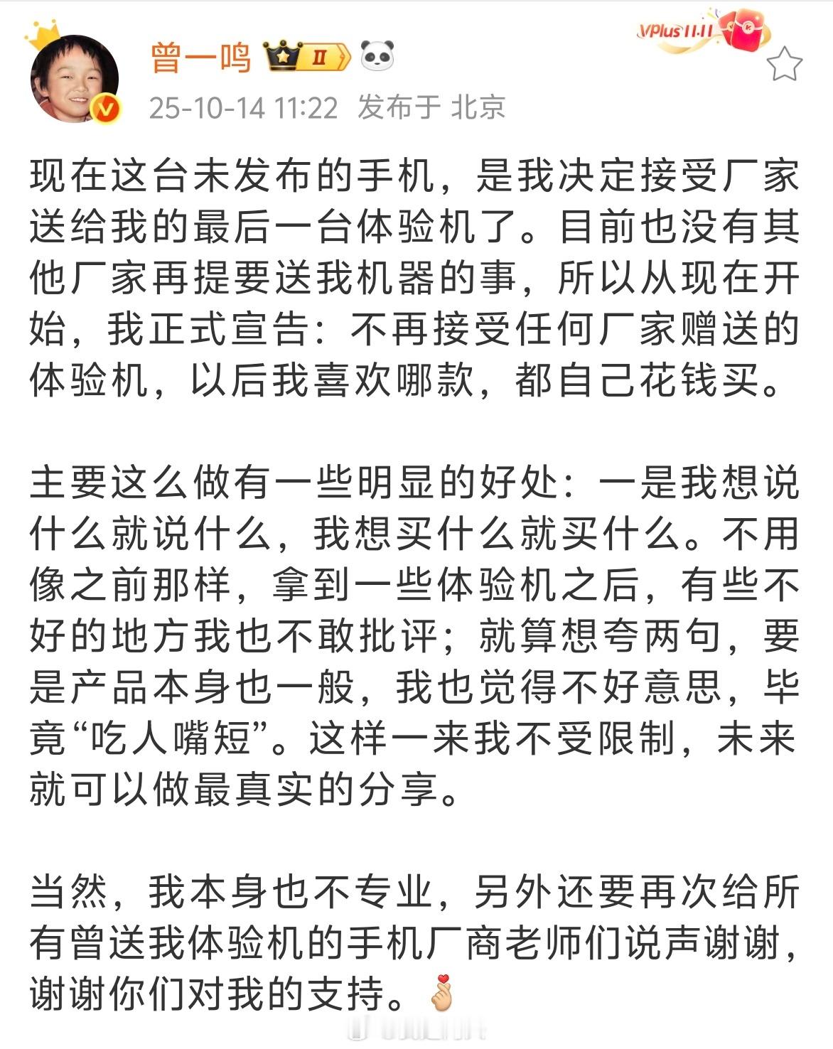 你不差钱,也不靠厂商吃饭,这一波等于是被品牌“白嫖”了。数码产品那点商单,跟你真正的大头收入比起来,根本不值一提。更何况签了保密协议,万一说错话,还可能因小失大、赔上几百万。所以现在这样反而最好——自费购买,才敢说真话。
