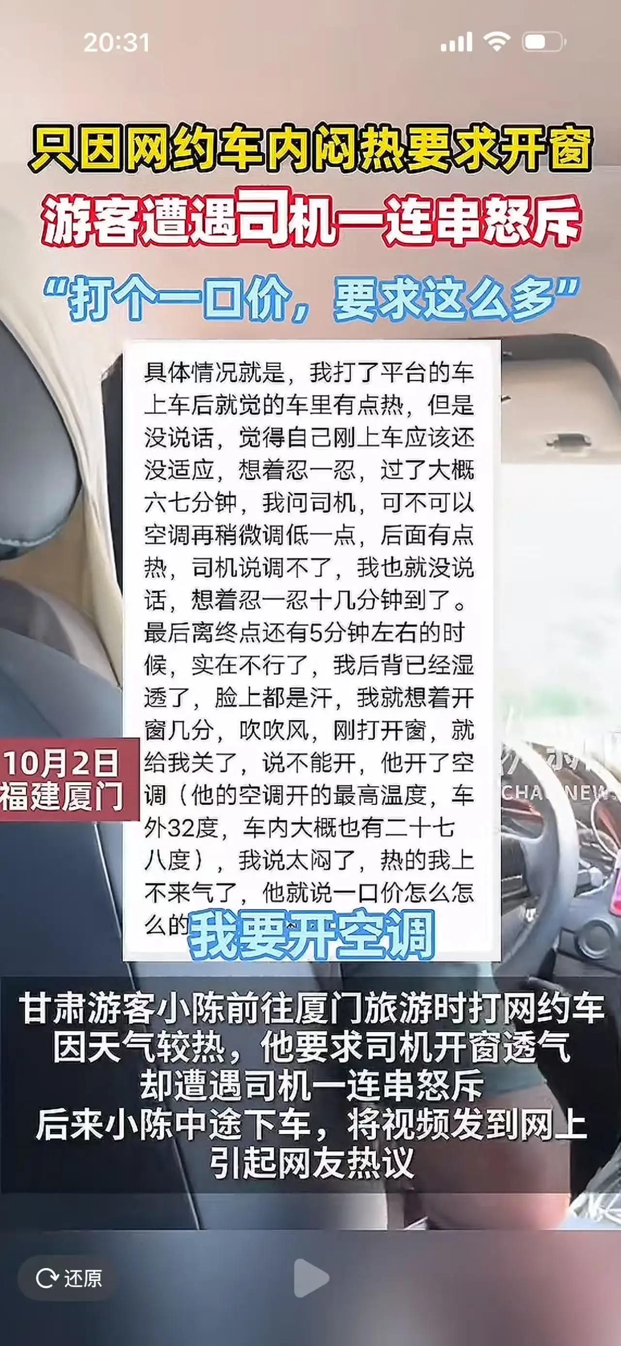 这是一场看似普通的网约车争端,却在瞬间点燃了无数人的情感共鸣。一个简单的“开窗透气”请求,竟然成为了矛盾的导火索,反映出我们这个时代一些深层次的问题——尊重、理解与人性。 事情的背后,似乎隐藏着太多值得反思的东西。旅游本是放松心情、开阔眼界的美好时光,却因为一句“开窗”引发了争执。这不仅仅是一次司机与乘客之间的摩擦,更折射出在快节奏、高压的生活中,人与人之间的理解与包容正变得越来越稀缺。我们每个人都在追求效率和利益,却忽略了最基本的尊重和温暖。 这位游客来自甘肃,远离故乡来到厦门旅游,带着对新环境的期待,却在小事上遭遇了冷漠与不理解。这种“打个一口价,要求还这么多”的抱怨声,或许也代表了某些司机在面对乘客合理需求时的无奈甚至愤怒。大家都在压力山大中挣扎,谁又愿意在意他人的小小请求?然而,正是这些微小的细节,才最能体现一个社会的温度。 网友们的“炸锅”声浪,更像是一面镜子,让我们看到了社会中那份被忽视的善意与尊重。有人说:“一句话能让人心凉一大片,也能让人感受到人间温暖。”的确,人与人之间的距离,或许比我们想象的更容易拉近,只要我们愿意多一点理解,少一点抱怨。 这起事件,虽然起因简单,却折射出我们每个人内心深处的渴望:被尊重、被理解、被善待。社会的温暖不在于高楼大厦的华丽,而在于每一个微小细节中的善意传递。 或许,我们都可以从这件事情中汲取一点力量——在喧嚣的生活中,学会多一点耐心,多一点理解。每一次微笑、每一句暖心的话语,都是这个社会最珍贵的财富。让我们不要等到“炸锅”才反思尊重的重要性,也不要等到失去了才追悔当初没有善待身边的每一个人。 在这个快节奏的时代,真正的幸福,或许就是在那些平凡的瞬间,彼此多一份关怀,少一份怨言。毕竟,生活本就是一场温暖的旅行,只要我们愿意用心去感受,就能发现,原来每一份理解,都是我们最宝贵的财富。你们那里“捉迷藏”用方言怎么说?