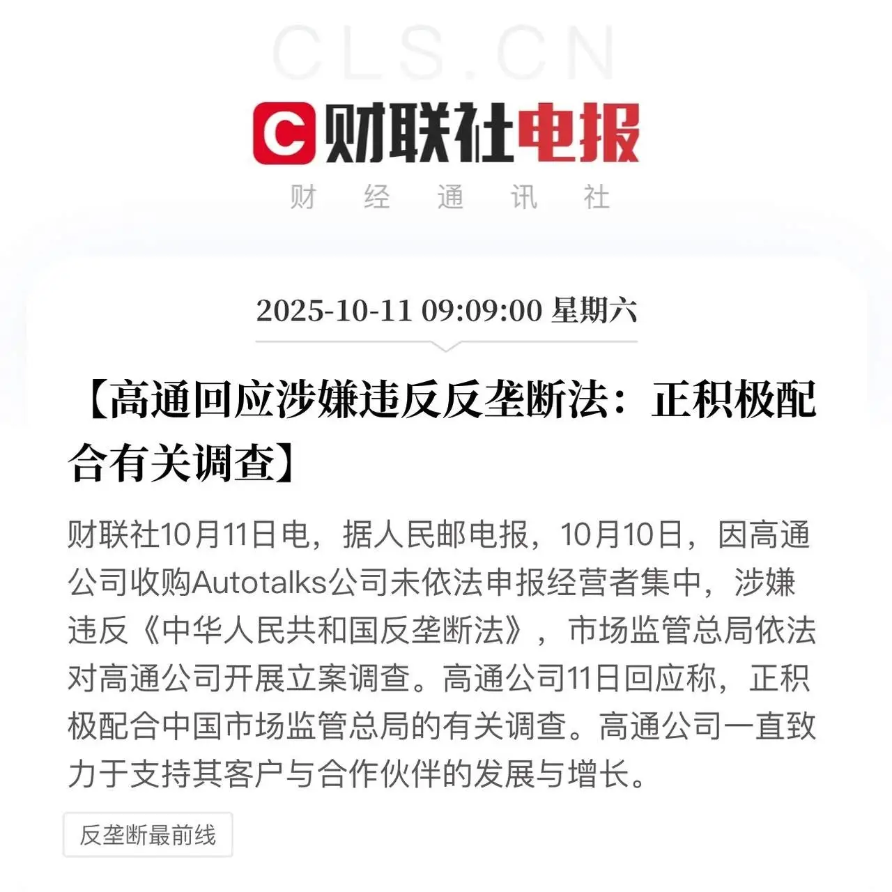 有不少网友认为,高通被反垄断调查,现在某些科技组装忽悠公司要慌了。其实我觉得这些网友见风就是雨!要知道,这件事主要问题在于2023年高通要收购以色列的Autotalks,这是做V2X车联网芯片的,并且2025年6月偷偷完成交易,高通是想绕开中国监管,门都没有!其实老美企业在国内不止第一次反垄断被调查,这次高通反垄断估计不在手机芯片上。在我看来,适当给高通一些警告也是好事,不能让老美过于嚣张。