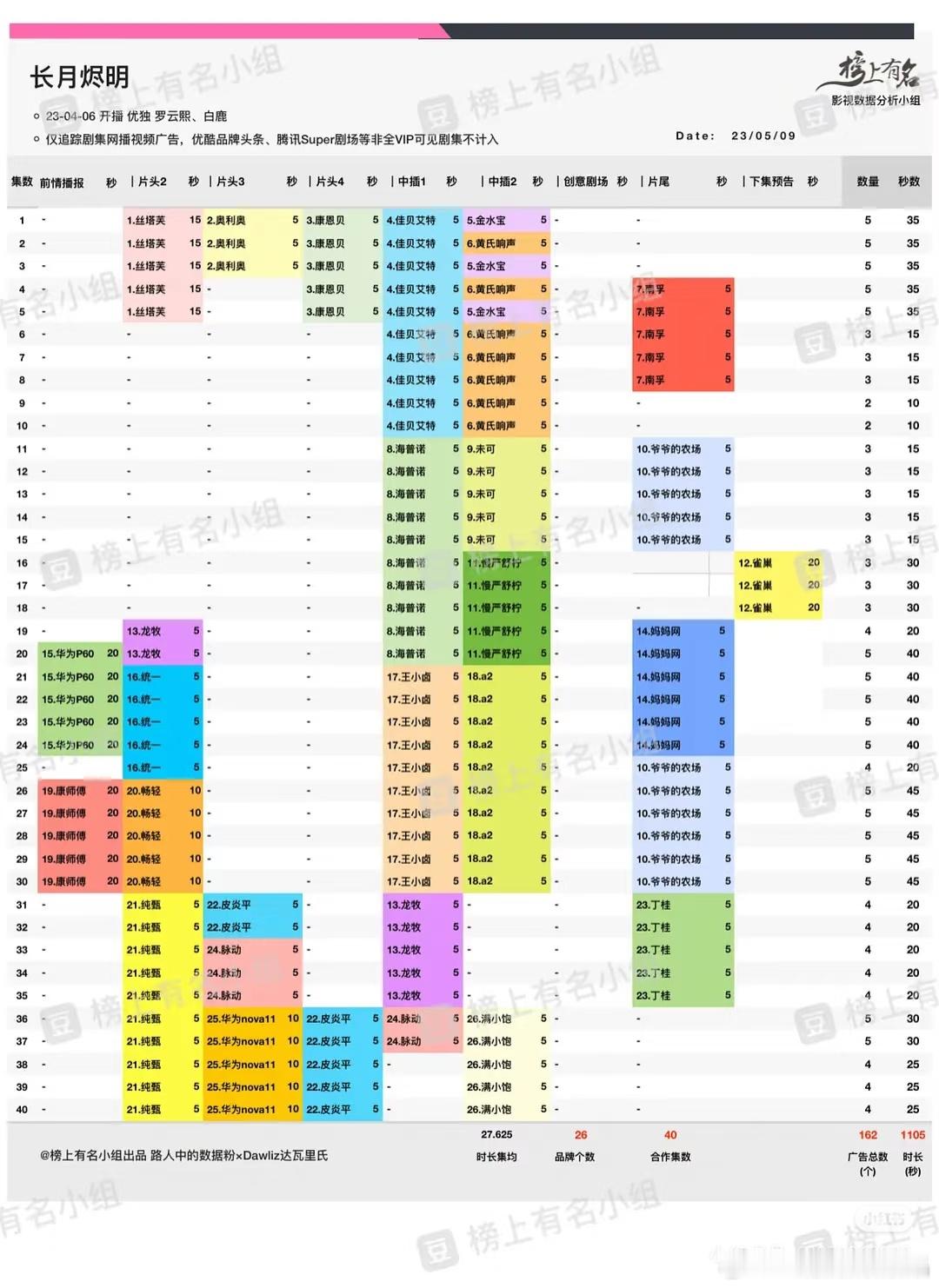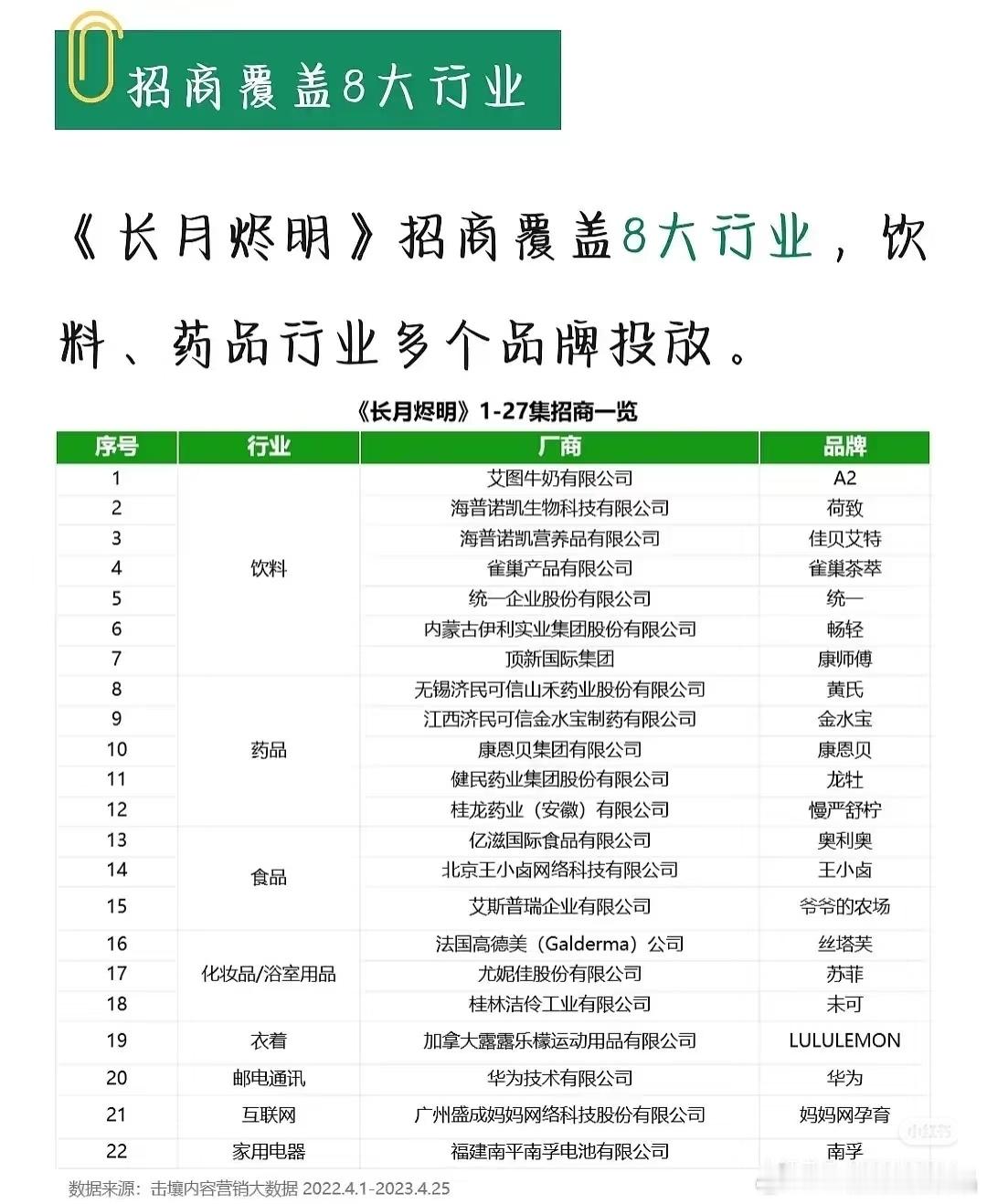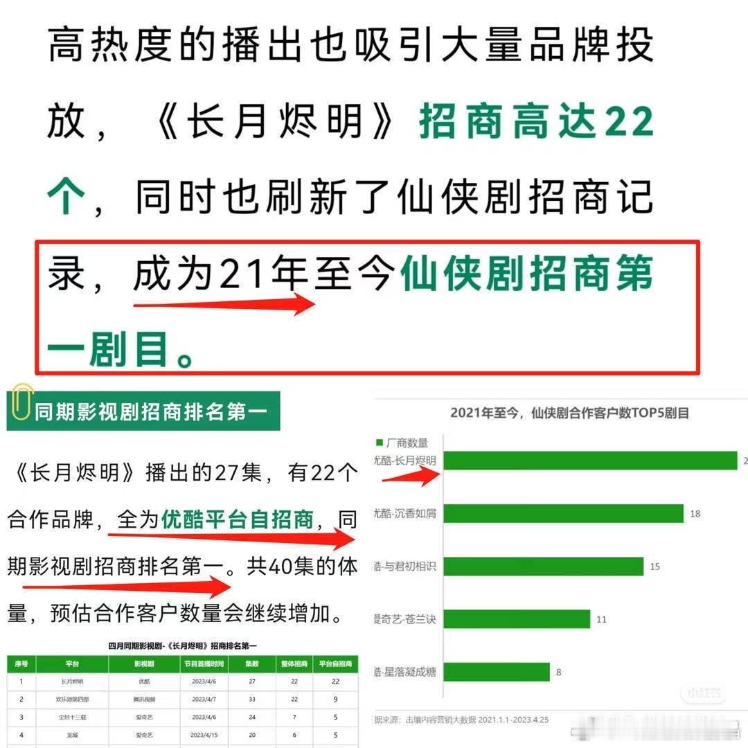 请看长月烬明的广告数据:该剧于2023年4月6日在优酷播出,一共162个招商广告,是从21年到长月烬明播出时,仙侠剧招商第一剧。