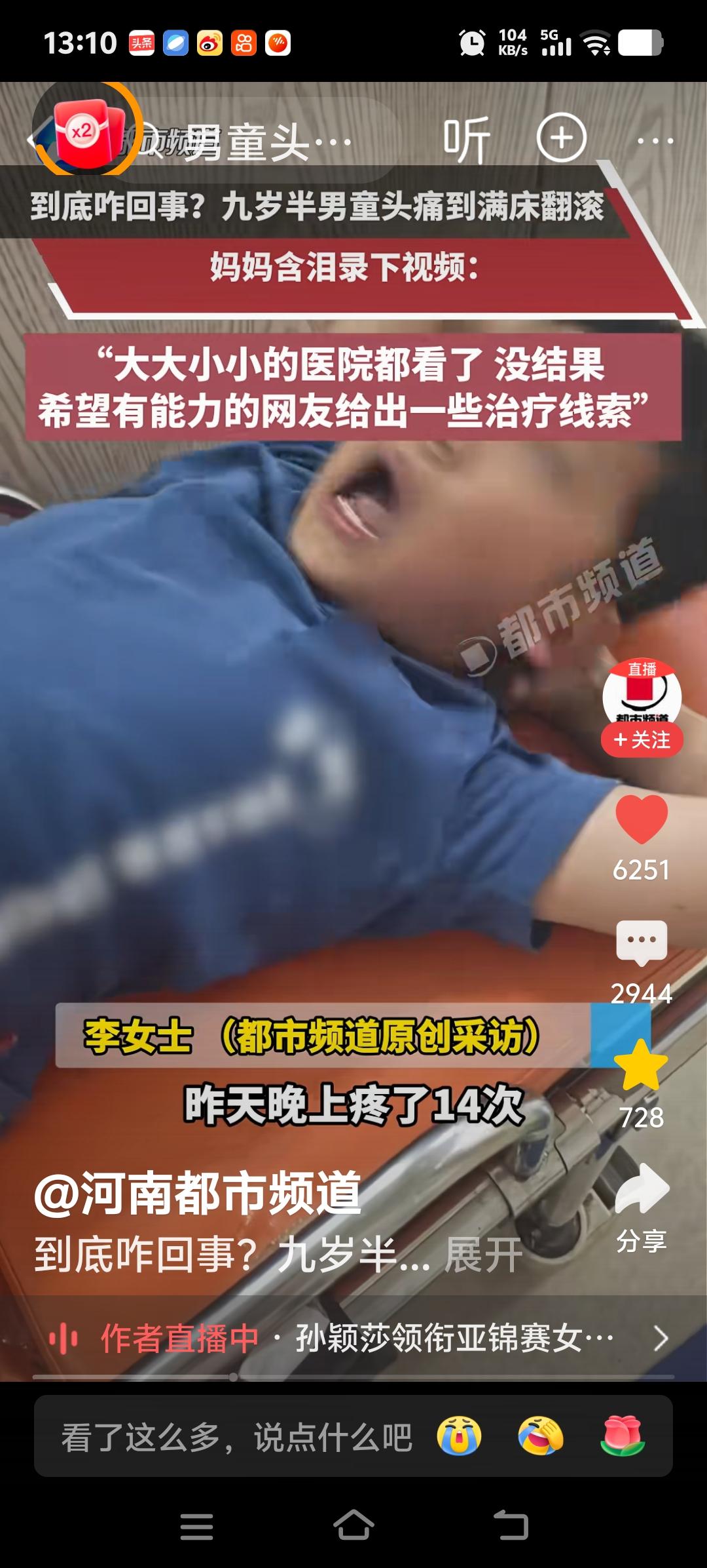 九岁半的男孩,头疼得满床打滚,这究竟是为何? 今日,在视频上看到河南许昌一位妈妈发布的内容,称孩子常无缘无故头疼,疼起来就满床打滚。他自己也说不上来,为什么会这样。 最近一次,一天就疼了14次,孩子疼的很痛苦,大人看了很无助。大大小小的医院都去检查过了,却始终查不出头疼的原因。无奈之下,她将视频发到网上,期望借助万能的网友,可以提供可以治疗头痛的线索。 查不出原因,那想必是疑难杂症了!这么小的孩子就要承受这般痛苦,实在令人心疼! 真心希望万能的网友能提供有效的线索。常言道,会者不难,难者不会。有时候,有些事对于不懂的人而言,或许难如登天,但对于行家来说,也许就是轻而易举的事。 家长既然把希望寄托在广大网友身上,希望有知道的网友帮帮他们吧! 秋日生活打卡季 图片来自网络,侵删致歉!