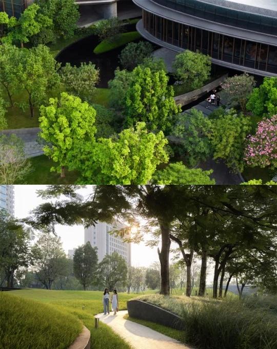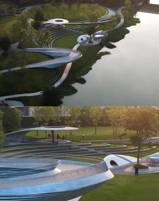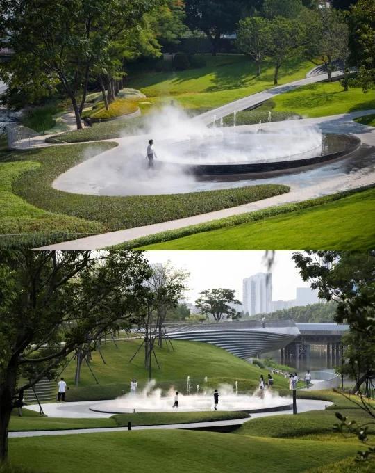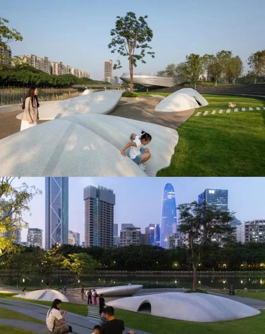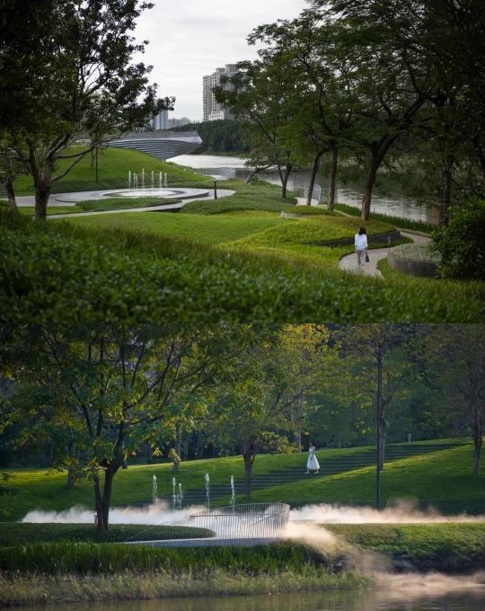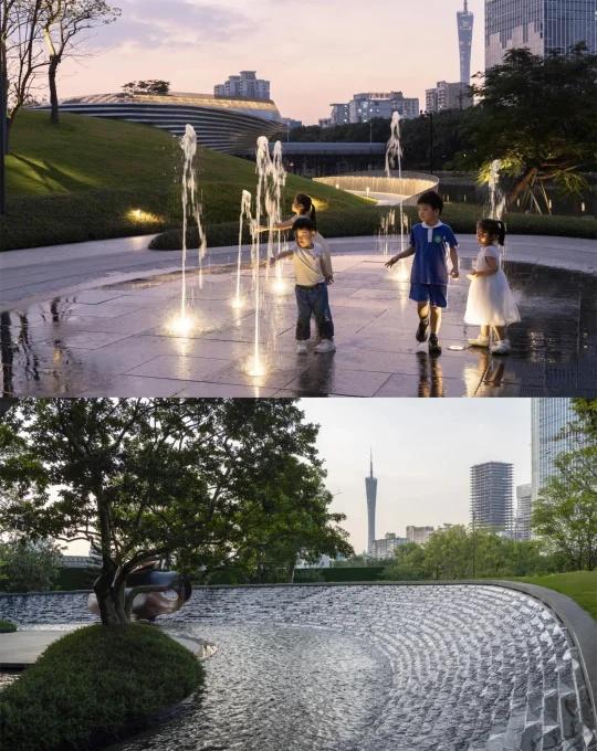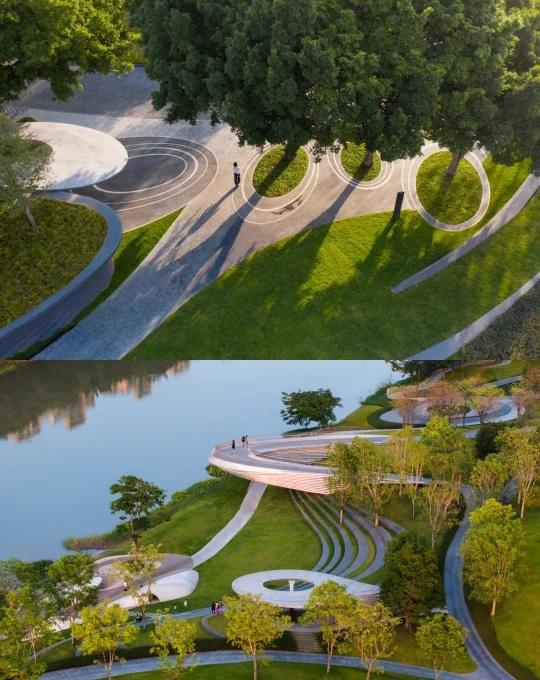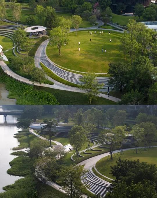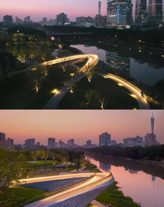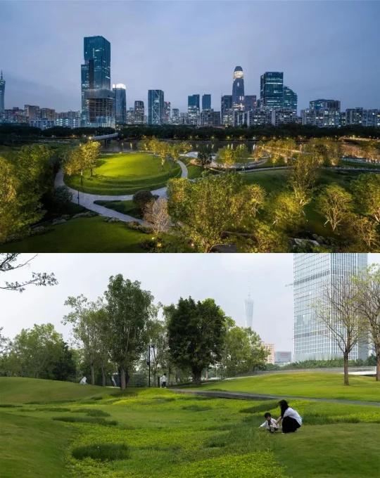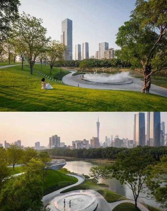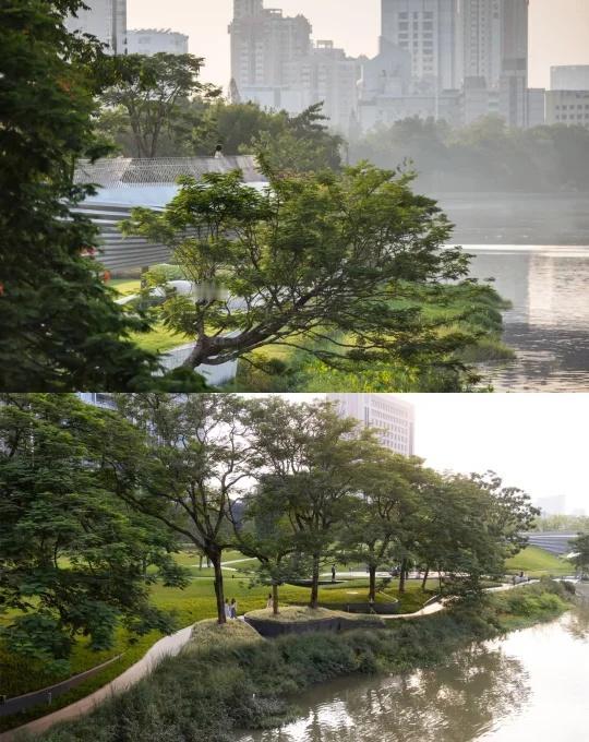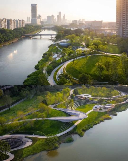 每日一例|🌊广州CBD藏着片“生态水岸” 🍃琶洲南滨水公园 | SWA Group(洛杉矶办事处) 📍项目背景 在广州琶洲CBD的黄埔涌河畔,曾是一道生硬的硬质堤岸,割裂了城市与水流的联系。如今,SWA Group将这片4公顷(一期)、全长300米的滨水空间,改造成了“绿色基础设施”——既修复了滨水生态,又串联起CBD核心、交通枢纽与居住区,还能缓解热岛效应,让快节奏的都市里多了片可亲近的自然水岸🌿。 ✨设计理念 设计以“生态笔法”为核心,灵感源自广州山地地貌。面对城市到滨水区4米多的高差,通过雕塑感的有机地形,消解了原工程化堤岸的生硬感。同时兼顾防洪需求,顺应水位动态变化(从低潮位+3.50到20年一遇洪水位+7.12),让景观、人与水体无缝融合,把自然体验与生态栖息地带回CBD核心。 🌟设计亮点 1⃣ 硬质堤岸大变身:将原有线性硬堤改造成覆绿缓坡,还完整保留了14棵古树(3棵入口大叶榕、11棵河岸大叶榕与凤凰木),步道穿梭其间,延续了黄埔涌的生态记忆🌳。 2⃣ 多样空间玩不停:高架步道穿绿谷、连水广场(夏季清爽,可排水变活动舞台);观景台能俯瞰广州塔;下方有露天剧场,西侧大草坪可办大型活动;还有河石灵感的亲子游乐场,满足不同需求。 3⃣ 生态修复超用心:按水位分布种水生/滨水植物,中央绿谷里的自然草甸,为CBD添了季相变化与野趣,提升生物多样性。 4⃣ 会所花园无边界:南侧花园用绿植、景墙过渡到私密会所,镜面水池与跌水景墙动静呼应;半室内绿意庭园模糊室内外,把公园的自然感带入建筑里。 📸项目信息 项目名称:琶洲南滨水公园(一期) 项目地址:中国·广东省广州市琶洲CBD(黄埔涌河畔) 景观设计单位:SWA Group Los Angeles Office 设计团队:邓宁、戴乔奇、张婧、杨南迪、萧炜伦、Chanon Wangkachonkait 项目面积:40000平方米(一期) 竣工年份:2022年 景观施工单位:硕泉园林股份有限公司 摄影单位:超越视觉 | 丘文三映 Chill Shine 文案参考:mooool设计平台(结合项目资料整理) 广州周末去哪儿 CBD生态公园 SWA景观设计 滨水公园打卡 都市自然秘境生态景观设计 景观设计 可持续景观 城市中的绿洲
