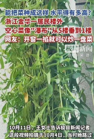 “活久见!”10月11日,浙江金华,一女子发现一栋居民楼被垂下的“绿色瀑布”覆盖,远看以为是绿萝,走近才发现是空心菜!网友:怪不得邻居没意见,开窗随手一掐就是一盘菜! 生活中空心菜常常出现在餐桌上,可估计很多人都不知道空心菜如果不收,最长能达到14米,14米是什么概念,足有4、5层楼那么高! 一女子路过一栋居民楼,发现整栋楼都被五楼垂下的植物覆盖,这植物枝叶繁茂,随风摆动时就像是一道流动的“绿色瀑布”,看着让人心旷神怡。 这道“绿瀑”瞬间吸引了女子的目光,远看她以为这植物是绿萝,走近仔细一瞧,这才发现竟然是空心菜,女子不由得吃了一惊,拿出手机拍了下来。 垂下的空心菜就像是天然的遮阳帘,透光阳光照射影子映在墙上,看起来十分梦幻,长这么长的空心菜确实很少见,许多路人都驻足欣赏。 能把菜种成这样,水平也挺高的,不仅美观还能食用,不少网友调侃道,怪不得楼下的邻居没有意见,不知道吃什么的时候,开窗随手一掐就是一盘菜,这也太方便了! 信息来源:《浙江金华一居民楼外,空心菜像"瀑布"从5楼垂到1楼,网友:开窗一掐就可以炒一盘菜》极目新闻