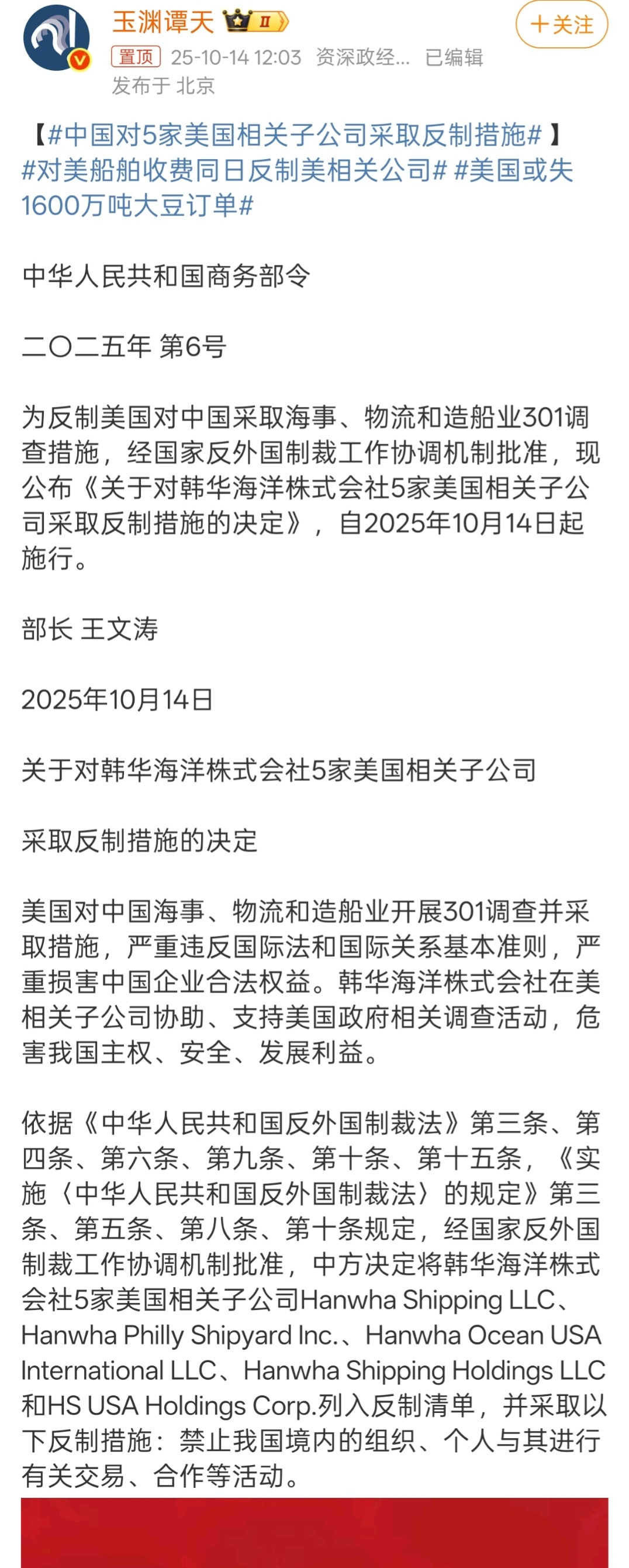依据《中华人民共和国反外国制裁法》第三条、第四条、第六条、第九条、第十条、第十五条,《实施〈中华人民共和国反外国制裁法〉的规定》第三条、第五条、第八条、第十条规定,经国家反外国制裁工作协调机制批准,中方决定将韩华海洋株式会社5家美国相关子公司Hanwha Shipping LLC、Hanwha Philly Shipyard Inc.、Hanwha Ocean USA International LLC、Hanwha Shipping Holdings LLC和HS USA Holdings Corp.列入反制清单,并采取以下反制措施:禁止我国境内的组织、个人与其进行有关交易、合作等活动。
