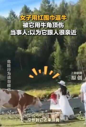 “这下后悔了吧!”10月11日,内蒙古,一女子写生时被牛打扰,她扯下脖子上的红围巾逗牛玩,谁知温顺的牛看到红围巾直接一头撞了过去,女子的腰被顶伤,网友:还逗牛,没看过斗牛吗? 看过斗牛比赛的人都知道,斗牛士拿着红布不断抖动,吸引牛撞过来,其实牛是色盲,红色并不会让牛激动,抖动的红色才是让牛撞过来的关键。 一名女子来到草原写生,正在专心画画时,一头牛突然从女子背后碰了她一下,女子被吓了一跳,转头看见温顺的牛后,她以为这头牛跟人很亲近,立马来了兴趣,想逗逗它。 女子顺手解下了自己脖子上的红围巾,放在牛的眼前,见牛没有反应,女子开始抖动手里的红围巾,吸引牛的注意力。 谁知,红围巾一抖动起来,牛的情绪立马开始激动,还没等女子反应过来,它直接朝着女子一头顶了过去,坚硬的牛角擦着女子的衣服,划伤了她的腰部。 这下可把女子吓得不轻,划伤的位置留下了一个长长的红印子,有的地方还破了皮,看起来十分骇人。 不少网友觉得女子胆子太大了,竟然敢模仿斗牛士,这下自作自受腰被牛给撞伤了,女子也很后悔自己的行为,估计以后再也不敢拿红布逗牛了! 信息来源:《女生写生时逗牛被顶飞腰部受伤》大象新闻