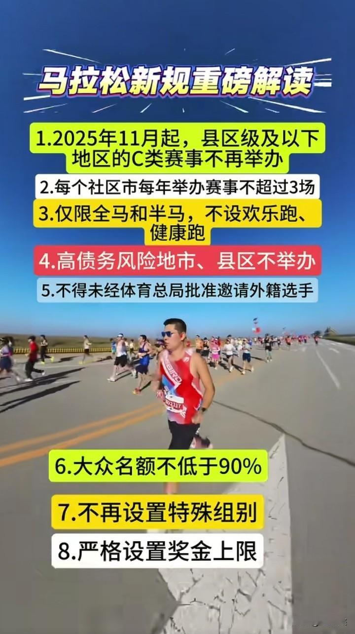 一觉醒来,改规定了, 黑人运动员都哭了。 “最快女护士”以后不用经常请假了,她的同事们笑了。 有关部门出了新规定,主要内容大概就是:不能随便举办马拉松比赛,不能随意邀请外国运动员参赛。 比赛的奖金提高了,比赛的规格也提高了,相只有全马和半马,取消了欢乐跑,显得更专业化了。 以后再也看不到某某县举行的国际马拉松比赛了,再也看不到一群人乌泱乌泱地往前跑,洪哄抢物资、随地大小便这样的混乱场景不会再有了。 以后再举行马拉松比赛,没有有关部门的批准,不能随便找黑人运动员参加比赛。不会出现领奖台上全是黑人的面孔,黑人运动员拿走所有的奖金这种现象了。 这样的马拉松你会不会报名?