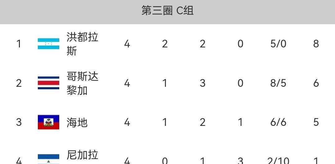 世预赛北美赛区 世预赛北美赛区第三阶段C组第四轮比赛战罢,洪都拉斯3-0海地排名小组第一,哥斯达黎加4-1大胜尼加拉瓜排名小组第二! 由于美国、加拿大、墨西哥三支东道主占据三个名额,所以北美赛区第三阶段的十二支球队竞争另外三个直通世界杯的名额,三个小组中成绩最好的两个小组第二获得附加赛的资格! 哥斯达黎加作为C组世界排名最高、且6次打进世界杯正赛、2014年巴西世界杯的八强球队,本次预选赛第三阶段开局并不顺利,首战1-1被世界排名第132的尼加拉瓜逼平,次战3-3主场艰难绝平海地,第三轮又和洪都拉斯0-0闷平,三连平让哥斯达黎加一度排名小组第三! 本场4-1大胜尼加拉瓜的比赛让哥斯达黎加暂时松一口气,如果想直通世界杯,哥斯达黎加下个月对阵海地和洪都拉斯的比赛必须全胜,哥斯达黎加多赛一场仅比A组第二多一分、和B组第二同分,所以那两个最好的小组第二,哥斯达黎加希望不大!
