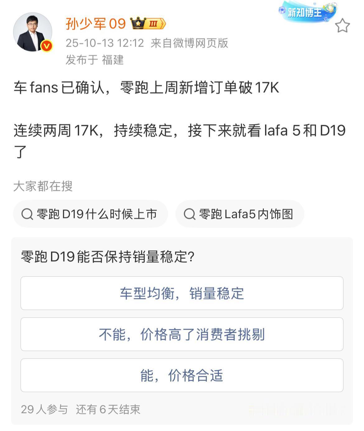 最新周销量出炉,零跑交付1.35万辆。 根据最新公布的数据显示,零跑汽车大概率将继续领跑新势力市场,因为它单周销量达到了1.35万台,展现出了强大的市场竞争力。值得一提的是,通过网传消息还可以得知,继国庆小长假卖爆、订单大增25K之后,上周零跑依旧延续热销的态势,连续两周新增订单突破了17K,意味着其后续销量还有很大增长空间。 那么零跑为什么这么受欢迎?跟其坚持“科技普惠”息息相关,每款车都做到了高配置、亲民价格,并且深耕10-20万主流新能源市场,企业运营健康,不压供应商库存,让供应商也能赚钱,让车主也能获得实惠,实现多方共赢。 以零跑C10为例,售价13万级的车型,就给到了8295智能座舱、激光雷达端到端组合辅助驾驶,以及605km续航+800V高压平台等越级配置,16分钟即可完成30-80%补能,用车体验足以媲美20万级新能源车。 因此,该车上市以来累销量已超16万台,同时还是今年1-9月新势力品牌中型SUV的销量第一。并且不仅在国内市场很热销,得益于零跑轻资产出海模式,零跑C10在海外市场也同样很受老外追捧,知名球星吉鲁就成为了第16万台车的车主。 值得一提的是,除了现有的C系列和B系列持续热销以外,零跑D系列旗舰D19也即将正式亮相,D19将搭载零跑最新最顶级的技术,冲击30万级市场,将拔高零跑的品牌价值。据此推测,今年零跑完成50万台的销量目标,应该是板上钉钉的事了。