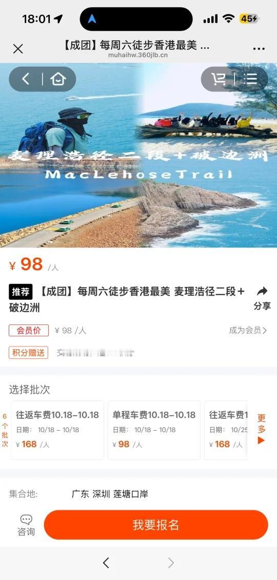 10.18周六深圳组队出发香港麦理浩径 徒步路线: 破边洲+二段中:万宜水库东坝→破边洲→万宜水库东坝→浪茄湾→西湾山→西湾亭10km 破边洲+二段中:万宜水库东坝→破边洲→万宜水库东坝→浪茄湾→万宜水库东坝6km ▼行程安排 选错集合点赶不上后果自负 08:30莲塘口岸A3集合过关 过关后集体乘旅游巴士车前往北潭涌,然后转车前往徒步起点破边洲。 10:30到达破边洲起点,开始徒步。 11:00到达破边洲开始拍照 11:30原路返回到东坝凉亭 12:30回到东坝凉亭休息20分钟吃午餐 12:50出发浪茄湾沙滩 13:30到达浪茄湾沙滩(自由拍照打卡不往西湾亭的小伙伴可以原路返回到东坝坐小巴到北潭涌) 13:50往西湾亭方向 15:30到达西湾山 17:00到达西湾亭坐小巴返回北潭涌行程结束。 17:40坐大巴返程莲塘口岸 以上为大概时间安排,具体行程时间领队根据现场调整 根据实际情况可能会调整起终点。徒步圈 徒步搭子 组队 户外徒步 户外徒步旅行 户外 爬山搭子 麦理浩径 破边洲