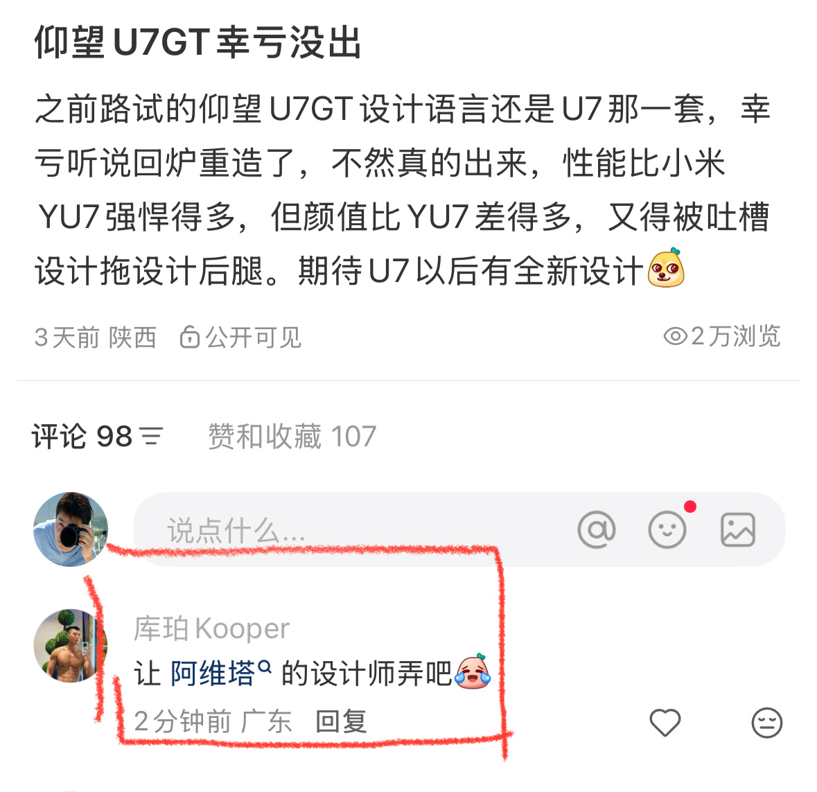 前两天我说传言中的仰望U7GT幸亏回炉重造,不然用U7的设计语言,还是太复杂、不高级。评论区有人说,让阿维塔设计师弄吧[笑cry]