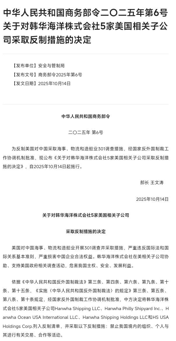 就在今天我国商务部发布公告,对韩华海洋株式会社的5家美国子公司发起反制 措施只有一条:禁止中国的公司和个人,与这些公司展开交易和合作。一言以蔽之,这些公司被中方彻底“拉黑”。 有人可能纳闷,韩华不是韩国企业吗?咱们为啥要制裁它的美国子公司? 先说说韩华海洋这公司到底啥来头。它以前不叫这名,叫大宇造船,是韩国造船业的老牌巨头,当年在液化天然气船领域那可是全球说一不二的主儿,多少国家排队求它造船。 可风水轮流转,这些年咱们中国造船厂硬是靠真本事拼出了一片天,把曾经的 “行业老大” 给逼得走投无路。 就拿数据说,2021 年的时候大宇造船一年就亏了 14 亿美元,2022 年接着亏,亏得底朝天,最后实在扛不住了,在 2023 年被韩华集团花 100 亿人民币收购,改名叫了韩华海洋。 这可不是咱们欺负它,是咱们的造船业实实在在崛起了,2024 年全球新船订单里,咱们中国占了 70%,韩国才只有 17%,连咱们的零头都不到,以前他们引以为傲的 LNG 船,咱们现在也能造了,2023 年订单占比都冲到 35%,首次超过了他们,这都是咱们工人和工程师一步步干出来的底气。 可美国看着咱们造船业这么争气,眼红得不行,自己又没本事竞争,就耍起了流氓。美国本土的商用造船业早就不行了,全球占比连 1% 都不到,却非要搞个 “让美国造船业再次伟大” 的计划,明着暗着打压中国。 他们干的最恶心的事,就是发起所谓的 301 调查,凭空污蔑咱们造船业搞 “非市场行为”,还打算加税、收额外的港口费,想用这种霸道手段把订单从中国抢走。 更可恨的是,他们还拉上韩国当帮手,韩国产业通商资源部都承认了,美国想让他们一起遏制中国造船业,韩华海洋居然就真的上了贼船。 韩华海洋的美国子公司可不是无辜被牵连的,他们是主动凑上去帮美国干活的。这家公司去年花 1 亿美元收购了美国费城造船厂,把这儿当成了帮美国重振造船业的据点,不仅接了美国海事局 5 艘国家安全多任务船的订单,还帮美国海军维修军舰,甚至从韩国调工人去给美国工人做培训,把造船技术手把手教给美国人。 今年 8 月,他们还宣布要给这个船厂再投 50 亿美元,韩国总统都跑去站台,说要和美国一起创造 “造船奇迹”。 更过分的是,这些子公司还直接协助美国的 301 调查,给美国提供所谓的 “证据”,甚至帮着设计怎么打压中国企业,这已经不是单纯的商业合作了,是明晃晃地帮着外人欺负自己的合作伙伴。 咱们中国从来不是任人拿捏的软柿子,这次出手就是要让他们知道,帮着霸权打压中国,就得付出代价。可能有人担心,制裁一家韩国企业的子公司,管用吗?太管用了! 韩华海洋看着风光,其实早就离不开中国市场和中国的原材料了。韩国造船业一年要从中国进口 104 亿美元的钢铁,占他们进口总量的一半,其中七成都是用来造船的,韩华海洋每造一艘船,五分之一的钢板都得从中国买。 更关键的是稀土,船舶上的永磁电机离不开这东西,韩国 70% 的船舶稀土都得从中国进口,没了咱们的稀土,他们的船就是一堆废铁。 现在咱们禁止和这 5 家子公司交易,等于直接掐断了他们的原材料供应,要么花几倍的价钱从别处买,订单直接亏本;要么就断供停产,美国那堆造船订单根本没法交付。 这事儿最解气的地方在于,咱们的反制既精准又有分寸,没乱打一气。这也是给所有跨国企业敲警钟,别想着 “脚踩两条船”,一边赚中国的钱,一边帮着别人害中国,这种好事以后想都别想。 美国和韩华可能以为靠联手就能遏制中国造船业,那真是打错了算盘。咱们现在的造船业早就不是十几年前了,2024 年一年就接了 1711 艘新船订单,总金额快一万亿人民币,全球一半以上的手持订单都在咱们手里。 以前韩国在 LNG 船领域垄断,现在沪东中华能造 27 万立方米的超大型 LNG 船,还接了卡塔尔 18 艘的大订单,技术不比他们差,价格还更实在。 美国自己造船效率低得离谱,咱们造一艘货轮 10 个月就能交货,他们得花一年半,成本还比咱们高 30%,就算韩华帮着培训,也补不上这技术和效率的鸿沟。 这次拉黑韩华的美国子公司,就是一次有理有据的正当防卫。美国搞单边主义,违反世贸规则,韩华帮凶助纣为虐,咱们依照《反外国制裁法》出手,天经地义。 这不是什么 “大国博弈” 的空话,是实实在在维护咱们中国企业的合法权益,维护咱们造船业工人的饭碗。那些觉得中国会忍气吞声的人,那些想靠着打压中国牟取暴利的企业,都该醒醒了。 韩华这次算是栽了个大跟头,希望其他企业能吸取教训,别再犯糊涂。咱们中国从来不想惹事,但绝对不怕事,这就是咱们的底气,也是这次反制最硬气的地方!