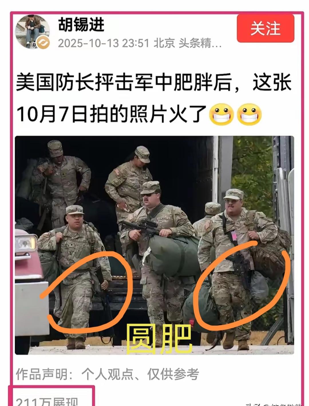 胡锡进发图证实了美防长抨击美国军中肥胖问题,原来是真的有!(下图) 近期,美国防长赫格塞思紧急集结“800名将领”进行“作训”改革,在进行改革的会议上训话时规定称:“美军以后,必须达到雄性战斗体能标准,军容不整或胖子的必须下岗…”。 看看胡锡进发了一下美军火了的图片,果然美兵展现出不少肥胖现象,也不知道平时部队是怎么训练的,搞得防长急着必须改革改变肥胖问题。