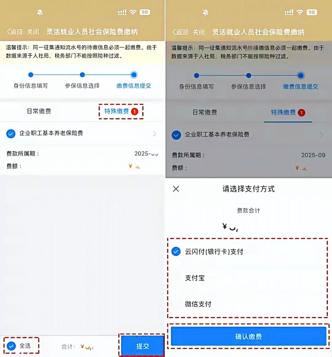 灵活就业社保基数补差如何申报?2025年9月18日,上海发布了《本市调整2025年度社保缴费基数上下限》的公告,明确了新一轮社保缴费基数的调整标准: 自2025年7月1日起,本市社保缴费基数的上限调整为37302元/月,下限调整为7460元/月。 本市2024年度全口径城镇单位就业人员平均工资为12434元/月。 👉关于补差,公告也指出: 灵活就业参保缴费人员因缴费基数调整产生的社会保险费补差部分,应在2025年10月底前,可通过“随申办”在线完成申报缴费,期间免收滞纳金。 🛑具体操作步骤如下: 1️⃣登录“随申办→首页搜索框中输入关键字“灵活就业”→点击“灵活就业人员社会保险费缴纳”进入服务页面 →并确认授权; 2️⃣进入“灵活就业人员社会保险费缴纳”界面,跳出系统提示,阅读后点击“确定”→办理对象选择“本人”或为“他人”缴费。系统默认为本人缴费,若为本人缴费的,可直接点击“下一步”; 3️⃣进入“缴费信息提交”。系统默认选择日常缴费,缴费基数调整导致的补差为特殊缴费,请手动选择“特殊缴费”,确定金额无误后,点击“提交”→进入支付界面完成缴费。 系统提供云闪付(银行卡)支付、支付宝、微信支付三种支付方式,缴费人可自行选择,并点击“确认缴费”,输入相应支付密码,完成缴费。 4️⃣缴费成功后,您可以在3个工作日后,搜索“灵活就业及城乡居民社会保险费缴费证明开具”,进入该界面开具缴费证明。 如线上不便操作,也可前往线下任一社区事务受理服务中心或办税服务厅完成清算补缴,别忘了在2025年10月底前及时缴费哦。 知识分享 干货分享 强烈推荐 干货