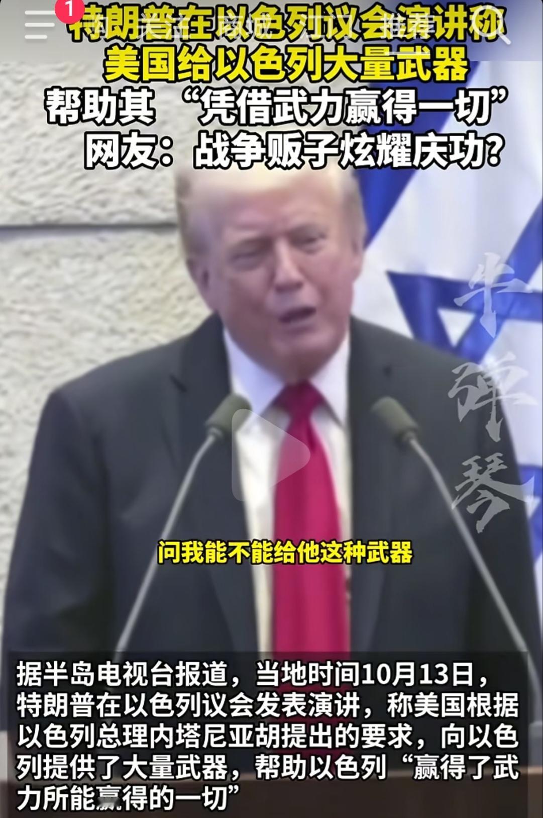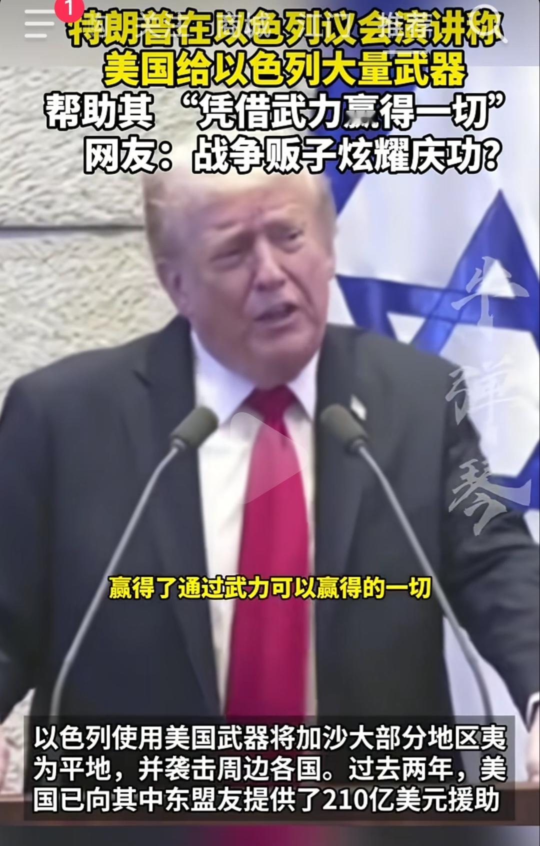 战争“贩子”炫耀庆功:特朗普称美国给以色列大量武器帮助其“凭借武力赢得一切”。 据半岛电视台报道:“当地时间10月13日,特朗普在以色列议会发表演讲称,美国根据以色列总理内塔尼亚胡提出的要求,向以色列提供了大量武器,帮助以色列“赢得了武力所能赢得的一切”,以色列使用美国武器将加沙大部分地区夷为平地,并袭击周边各国。过去两年,关国已向其中东盟友提供了210亿美元援助”。 这是典型的战争贩子在炫耀庆功!可以说近年来,以色列在中东恣意妄为、无恶不作造成巴勒斯坦人民6万多人死亡等恶行,这与美国的纵容、包庇和军事装备援助等支持有着密切关系,如果內塔尼亚胡犯了“战争罪”,那么美国就是“帮凶者”无疑。 然而,说特朗普也是个充满争议的人物一点不假。他竟然曾经可以一边在数显着自己结束了多少战争的和平使者荣耀,心心念念拿到诺贝尔和平奖。现在又另一边又在显摆美国提供多少武器给以色列把加沙夷为平地,袭击周边各国,还口口声声说美国的武器帮以色列在“赢得了一切”,这本身就是战争贩子显耀庆功。更突出特朗普的言行举止,前后矛盾、顾左不顾右,毫无章法、更没有条理,是个实实在在充满争议性的政治人物。