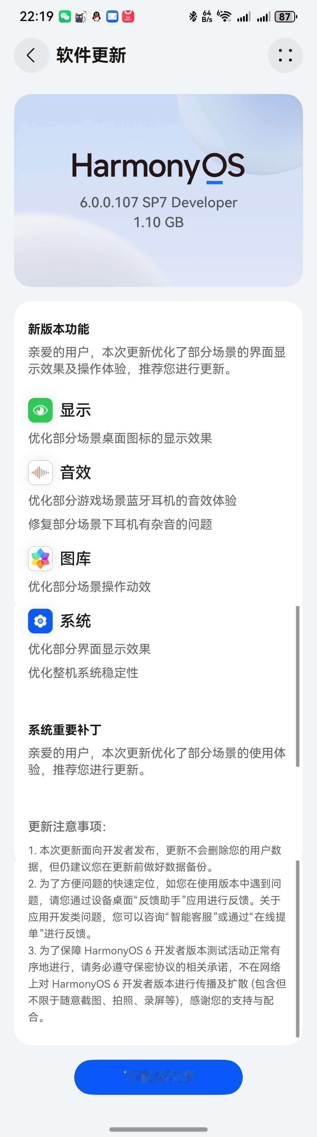 鸿蒙NEXT nova系列推送6.0.0.107(sp7)1个多G内容,主要还是以系统核心为主去优化更新、显示优化、音效优化、图库优化,系统优化稳定性等等,107相对之前的话, bug还是有点多,分别推送,还没睡的可以刷刷[耶]