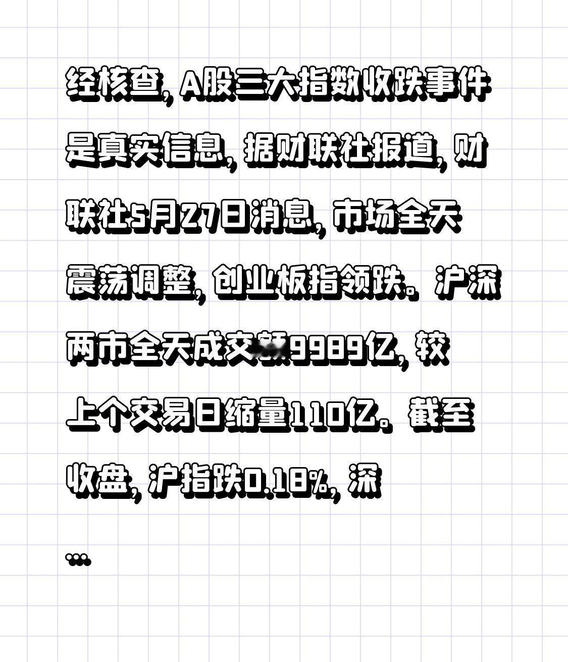经核查,A股三大指数收跌事件是真实信息,据财联社报道,财联社5月27日消息,市场