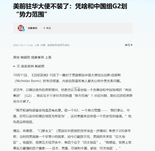 据观察者网的报道:美前驻华大使不装了;凭啥和中国组G2划“势力范围”。日前,美国