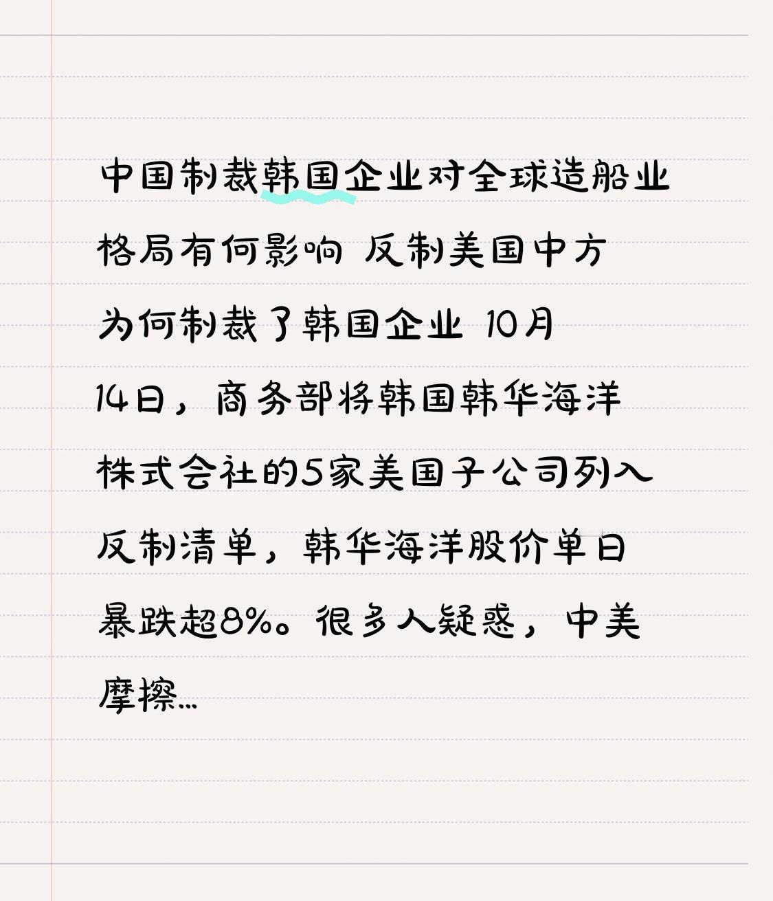 中国制裁韩国企业对全球造船业格局有何影响 反制美国中方为何制裁了韩国企业 10月14日,商务部将韩国韩华海洋株式会社的5家美国子公司列入反制清单,韩华海洋股价单日暴跌超8%。很多人疑惑,中美摩擦为何制裁韩国企业?其实,这是对其协助美国对华造船业“301调查”的回应,它向美方提供行业数据等,成了美打压中国产业的“帮凶”。 当前全球造船业“中、韩、日”三足鼎立,中国占全球超50%市场份额,商用船舶订单超60%,全品类覆盖。韩国以22%份额居次,主要靠韩华海洋,它在LNG船技术高端市场有竞争力。制裁韩华海洋,或削弱韩国造船业竞争力,进一步巩固中国在全球造船业的主导地位。