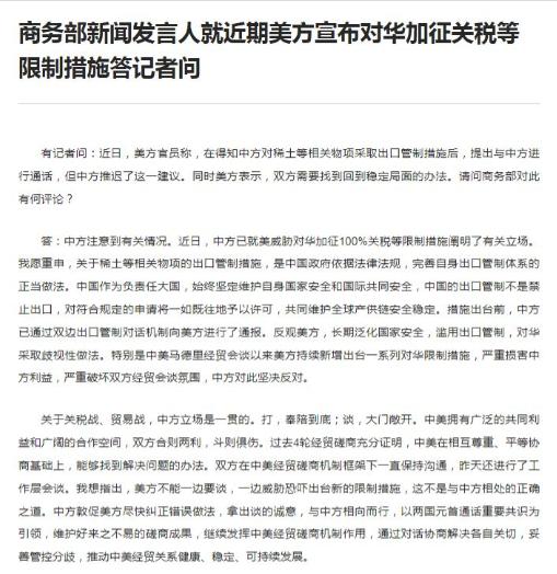 商务部终于接起美方电话,关于稀土管制,中方一步不退 14日,商务部发言人回应了