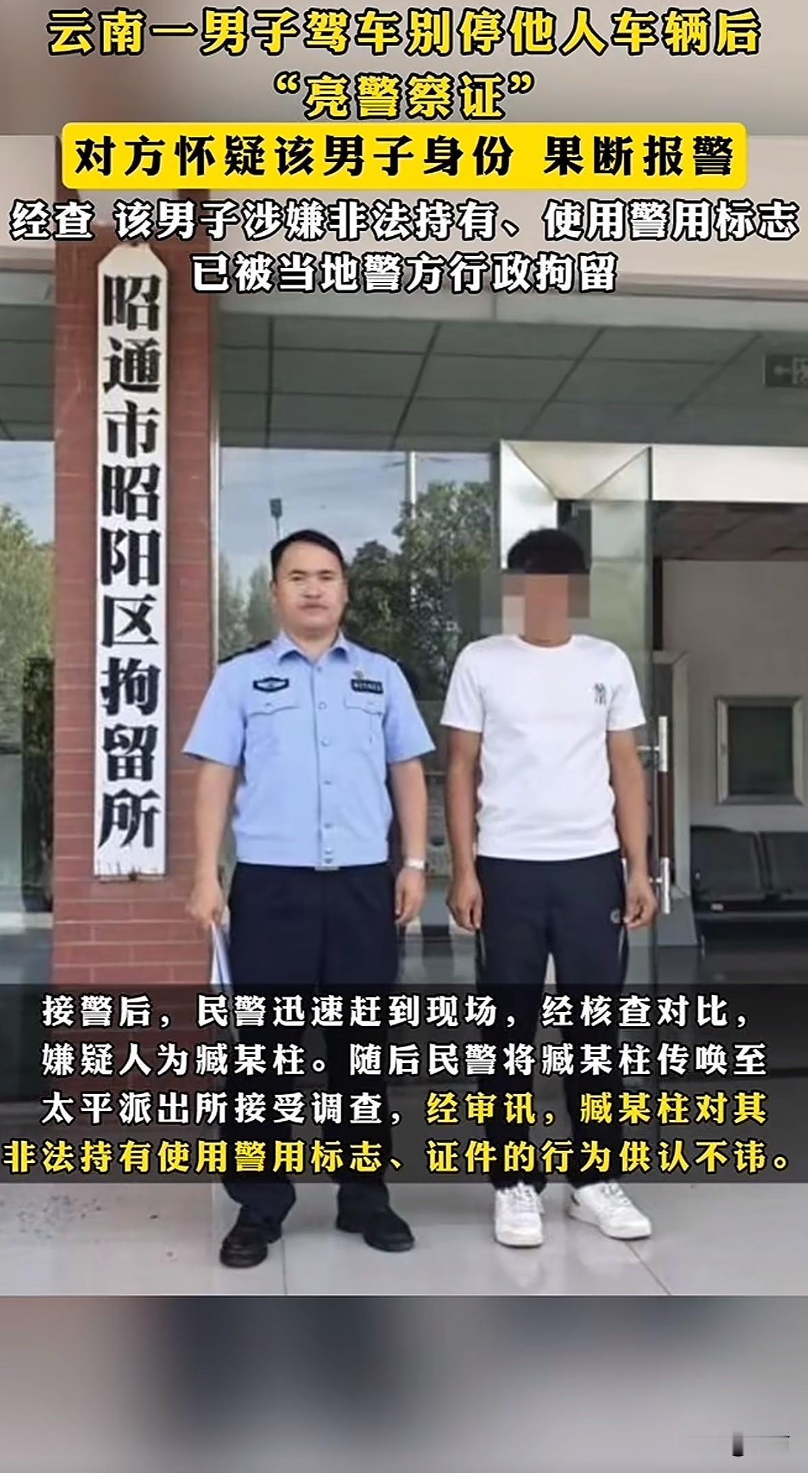 云南昭通,陈某驾车避让车辆时被白色轿车别停。对方下车亮“警察证”,说他涉嫌危害公共安全罪。陈某起疑,直接报了警。 民警赶到核查,确认男子叫臧某柱,根本不是警察。他对非法持有、使用警用证件的事认了。最后臧某柱被行政拘留五日。 警用标志和证件是警察专用的,私人持有使用本就违法。这人借着假证耍威风,真是错得离谱。 还好被别停的司机没慌,及时报警戳穿了假身份。要是真被唬住,指不定还得受委屈。 警察身份代表的是公信力,哪能随便冒充。这种行为不仅破坏秩序,还会消解大家对警察的信任。真得好好严惩,给那些想耍小聪明的人提个醒。