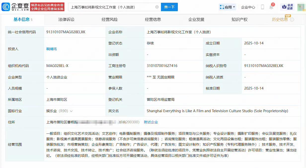 鞠婧祎升级“鞠总”!新工作室藏野心,这是要自己造剧本了? 家人们,鞠婧祎又搞大动作了!10月14日刚成立“万事如祎”工作室,还是个人独资,业务从写剧本到拍电影、做演出经纪全涵盖。 之前的“橘事顺利”刚打稳基础,新工作室直接瞄准内容生产,这是从“演员”往“项目操盘手”冲啊!名字连起来“橘事顺利,万事如祎”还藏着巧思,看来“鞠总”的事业版图要彻底铺开了!