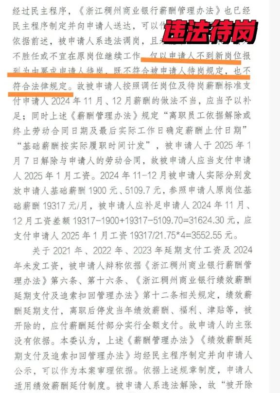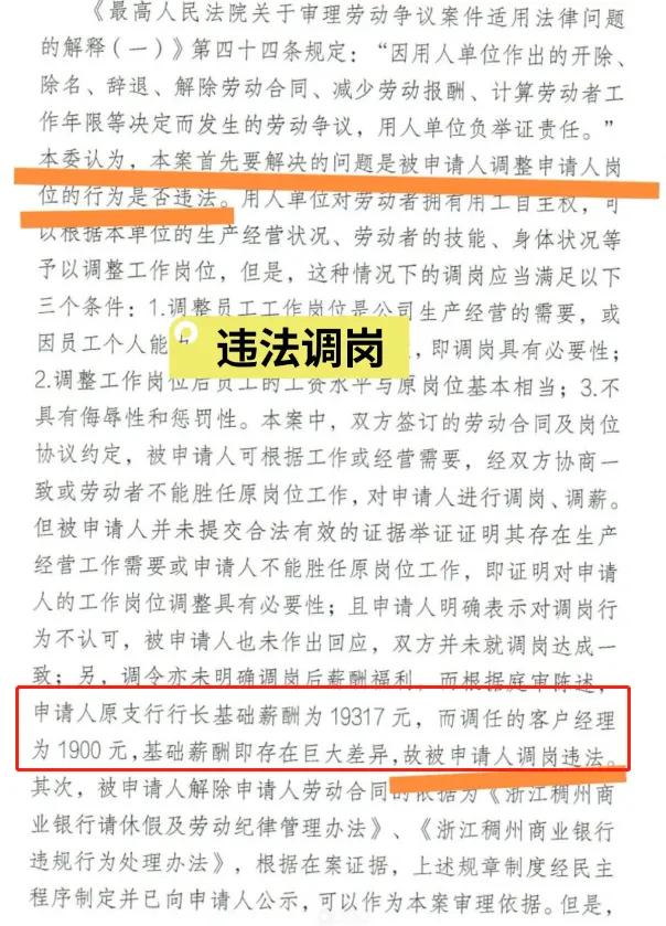 银行赔了行长79万,又一家银行栽了大跟头,让不少银行人看到了希望。近日,总部位于义乌的浙江稠州银行,输掉了一场普通人多以为赢不了的官司。对广大银行人来说,很有代表性。 原告是该行一家支行的行长,原行长基本工资19317,加上管理奖励,年薪超过38万。却无故被银行调到客户经理岗位,工资降了近10倍只有1900。行长认为这个调岗违法,拒不接受,最后通过法律诉讼赢得了正义。他公开的判决书显示,被告稠州银行违法解除劳动合同,需要赔偿员工24.93万,再加上基本工资差额和延期支付的工资等,合计赔偿79.11万,行长获得了大胜。 事情的根源,就在于这个行长对稠州银行的调岗坚决说不,换做普通人99%都是咬牙被动接受。关键是稠州银行没有任何协商沟通,也没提供具体理由,就把一个支行行长降为大厅客户经理,在正常人看来,这不只是巨大的落差感,而是带有明显的侮辱或是惩罚性质。行长没有接受调岗,而是继续在原支行上班,银行以旷工为由直接解除合同,更是以各种理由拒绝发放差额工资及延期发放的绩效奖金。银行如此霸道的做法激怒了这个行长,先是劳动仲裁赢了,稠州银行不服提起诉讼,结果还是败了,被判赔偿行长合计79万。 案件最核心一点,就是稠州银行的调岗合不合法,银行行长拿出劳动法,明确企业对员工调岗不是想怎么来就怎么来,而是要符合三个条件: 第一,调岗的必要性,新岗位工作强度、内容同原岗位相当。既是企业所必需,也得符合员工个人能力。 第二,新岗位工资应与原岗位持平,不得低于原岗位。 第三,岗位调整不具有侮辱性和惩罚性。 很显然,不管是银行还是企业,给员工的调岗很难全部满足以上条件,只不过胳膊拧不过大腿,多数人都是白白认栽。这个行长没有坐以待毙,银行更拿不出行长无法胜任原岗位的证据,输掉官司毫无悬念。 这个案例很不寻常,不光对银行人有所启发,对普通打工牛马也一样,对自己遭受的不公,就应该果断拿起武器维护自己的权益。人家既然都好意思摆明整你,你还有什么不好意思争取自己的利益,说不定还能拿到一大笔赔偿。
